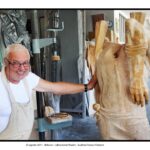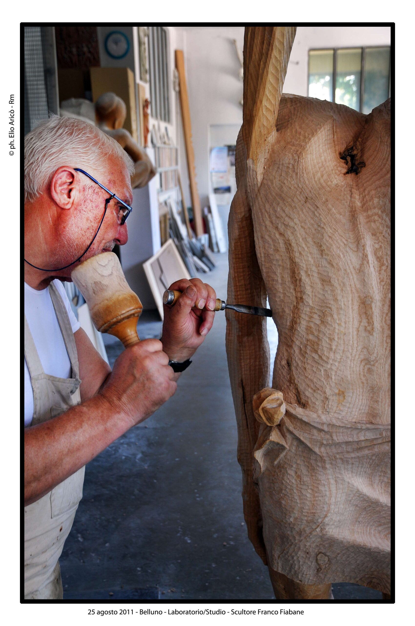 Nel suo laboratorio il tempo sembra rallentare, seguendo il ritmo paziente delle mani e del legno. Le immagini raccontano Franco Fiabane al lavoro nell’estate del 2011: uno scultore immerso nel dialogo silenzioso con la materia, circondato da trucioli, attrezzi e forme che nascono poco alla volta. Nel laboratorio si vedono opere in diverse fasi di lavorazione: grandi tronchi appena sbozzati, figure ancora incomplete, parti separate – braccia, busti, rilievi – che attendono di essere ricomposte o rifinite. Accanto alle sculture tridimensionali compaiono pannelli scolpiti a bassorilievo, scene narrative che richiamano il racconto popolare, la memoria collettiva, la vita quotidiana. È un mondo coerente, in cui il gesto artigianale si intreccia alla dimensione simbolica. Le fotografie di Elio Arico’ mostrano Fiabane concentrato, a volte sorridente, a volte assorto. Indossa il grembiule da lavoro, osserva l’opera da vicino, la tocca, la gira, come per verificarne l’equilibrio e l’anima. Il rapporto con il legno è fisico e diretto: martello e scalpello diventano strumenti di dialogo più che di forza, capaci di seguire le venature naturali del materiale e assecondarne le imperfezioni.