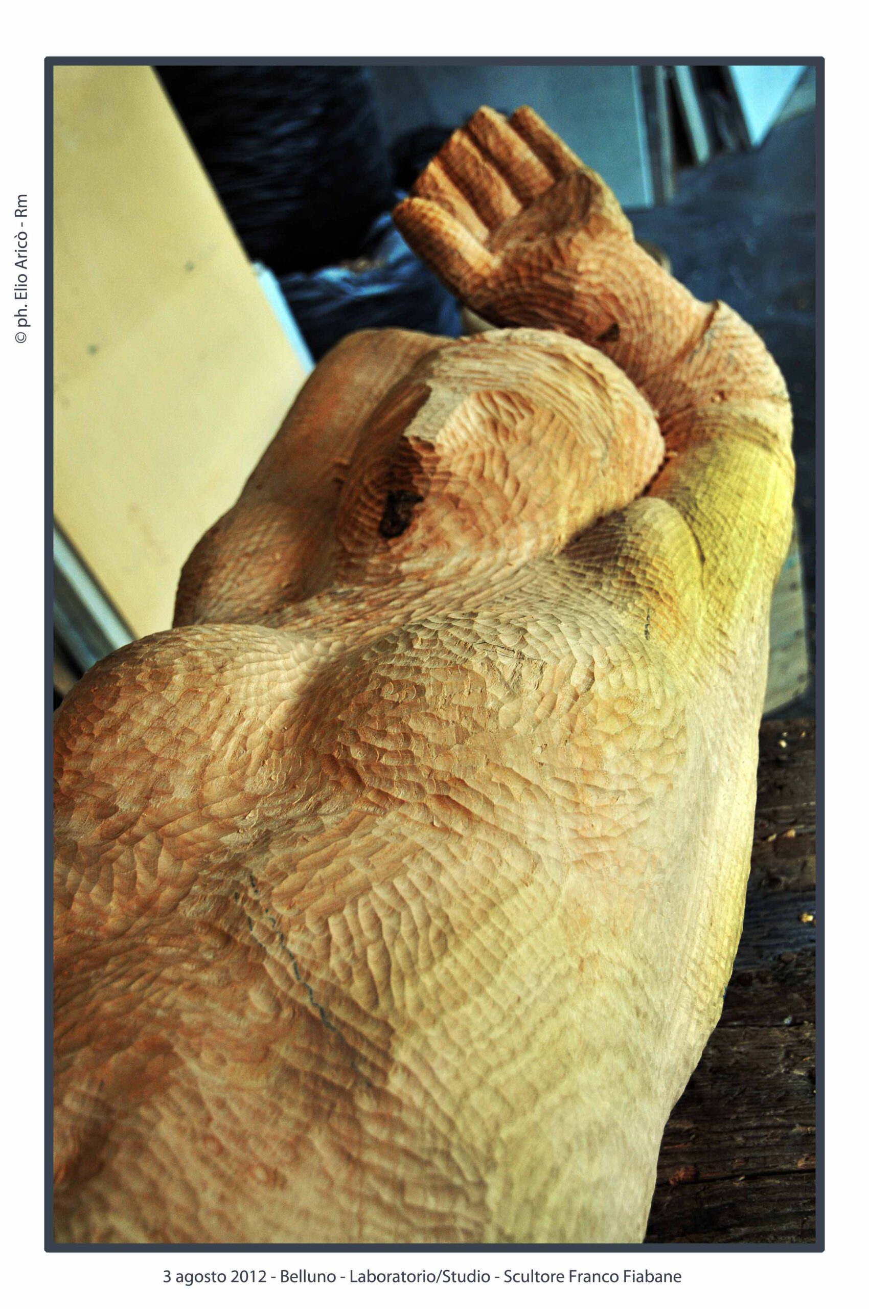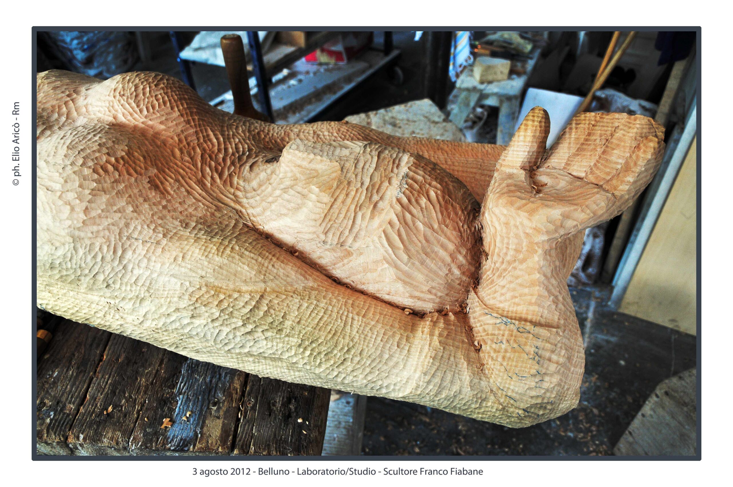 il Cristo deposto è una scultura lignea alla quale Franco Fiabane era profondamente legato. L’opera è stata realizzata nel 2011: la datazione al 2000 riportata nel catalogo è dunque errata e merita una necessaria correzione, importante non solo dal punto di vista archivistico, ma anche per una corretta lettura del percorso artistico dello scultore. Il Cristo deposto rappresenta la più alta e intensa espressione drammatica del dolore che Franco l’artista trasferisce nel legno. È un’opera in cui confluiscono, in modo magistrale, sensibilità umana, studio rigoroso e una straordinaria padronanza del mezzo espressivo. “Franco Fiabane – come ricorda il fotografo-amico Elio Aricò- era infatti estremamente attento all’anatomia umana, oggetto di un’osservazione costante e approfondita nel corso della sua ricerca artistica. In questa scultura egli concentra tutta la sua conoscenza anatomica e la mette al servizio dell’espressione emotiva: il corpo di Cristo non è idealizzato, ma reale, segnato, fragile, profondamente umano”.