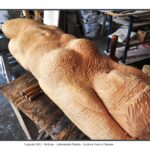 Nel suo laboratorio il tempo sembra rallentare, seguendo il ritmo paziente delle mani e del legno. Le immagini raccontano Franco Fiabane al lavoro nell’estate del 2011: uno scultore immerso nel dialogo silenzioso con la materia, circondato da trucioli, attrezzi e forme che nascono poco alla volta. Nel laboratorio si vedono opere in diverse fasi di lavorazione: grandi tronchi appena sbozzati, figure ancora incomplete, parti separate – braccia, busti, rilievi – che attendono di essere ricomposte o rifinite. Accanto alle sculture tridimensionali compaiono pannelli scolpiti a bassorilievo, scene narrative che richiamano il racconto popolare, la memoria collettiva, la vita quotidiana. È un mondo coerente, in cui il gesto artigianale si intreccia alla dimensione simbolica. Le fotografie di Elio Arico’ mostrano Fiabane concentrato, a volte sorridente, a volte assorto. Indossa il grembiule da lavoro, osserva l’opera da vicino, la tocca, la gira, come per verificarne l’equilibrio e l’anima. Il rapporto con il legno è fisico e diretto: martello e scalpello diventano strumenti di dialogo più che di forza, capaci di seguire le venature naturali del materiale e assecondarne le imperfezioni.