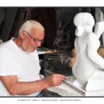 Le immagini di Elio Aricò raccontano non solo l’opera compiuta, ma anche il processo creativo: Fiabane colto nel gesto lento e concentrato dell’incisione, mentre definisce i volumi, leviga, approfondisce le ombre. È uno sguardo intimo dentro il laboratorio dell’artista, dove la scultura prende forma attraverso il rapporto fisico con il legno.