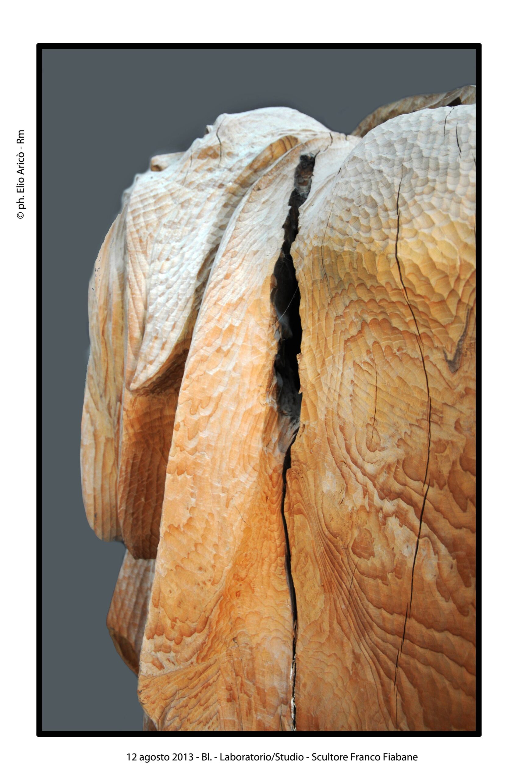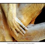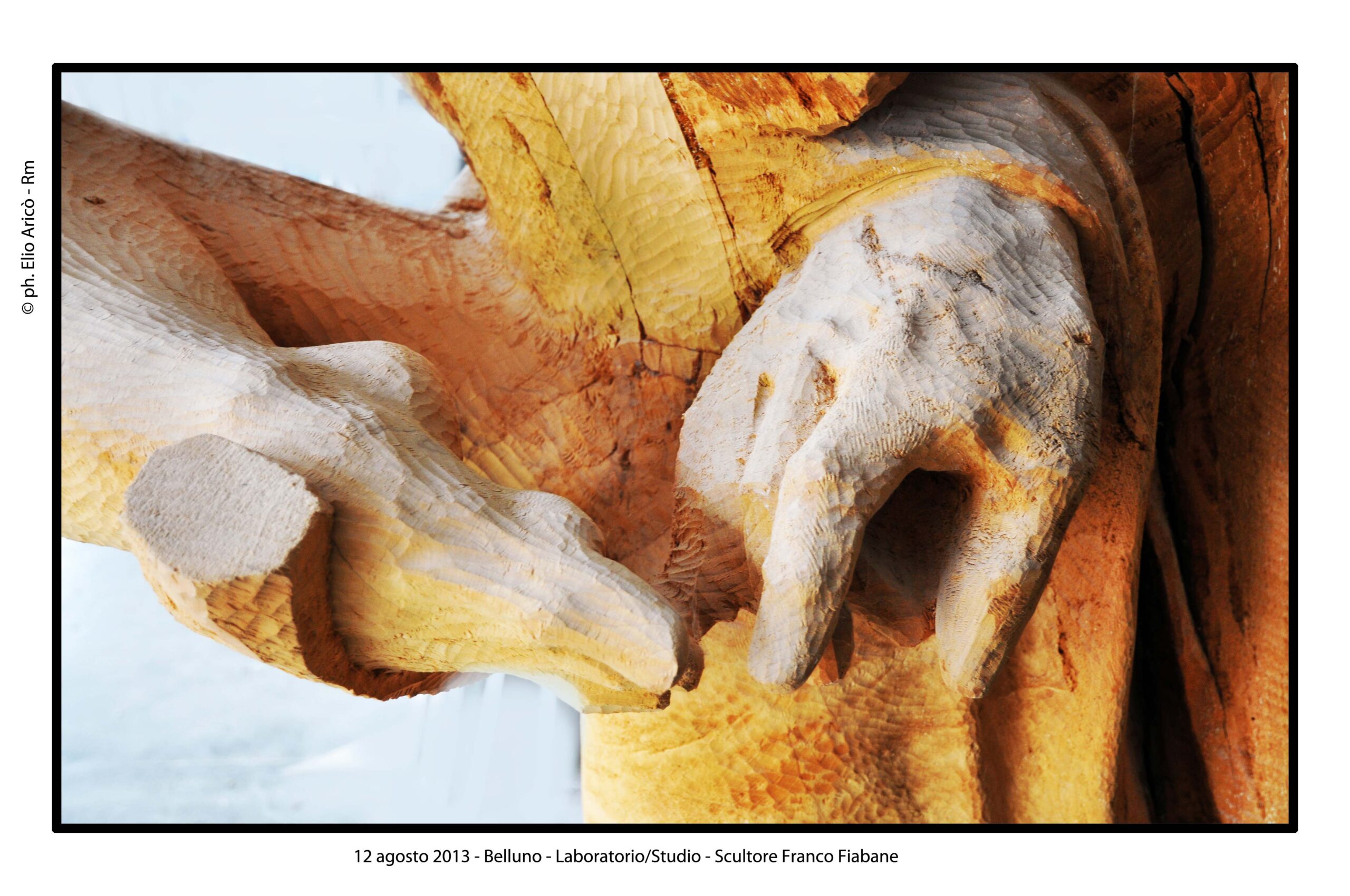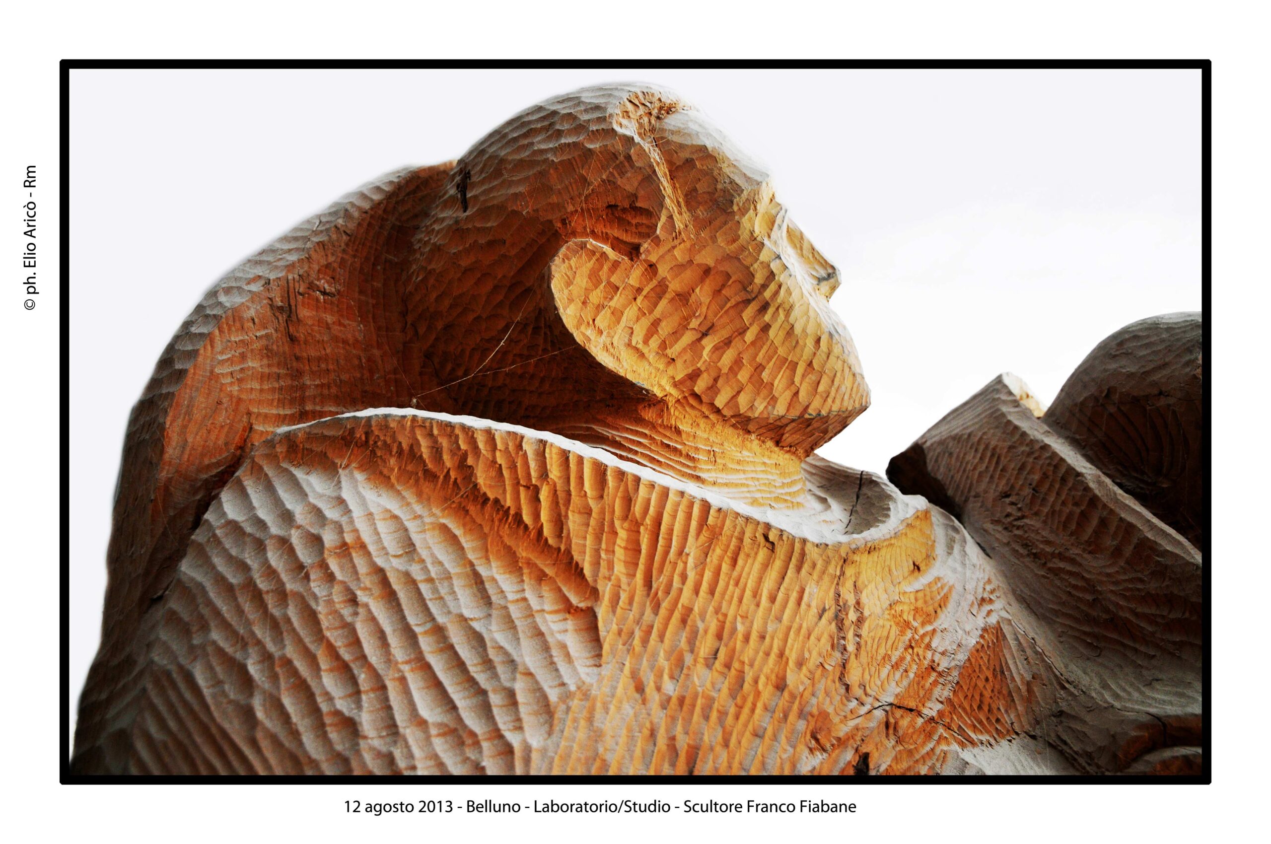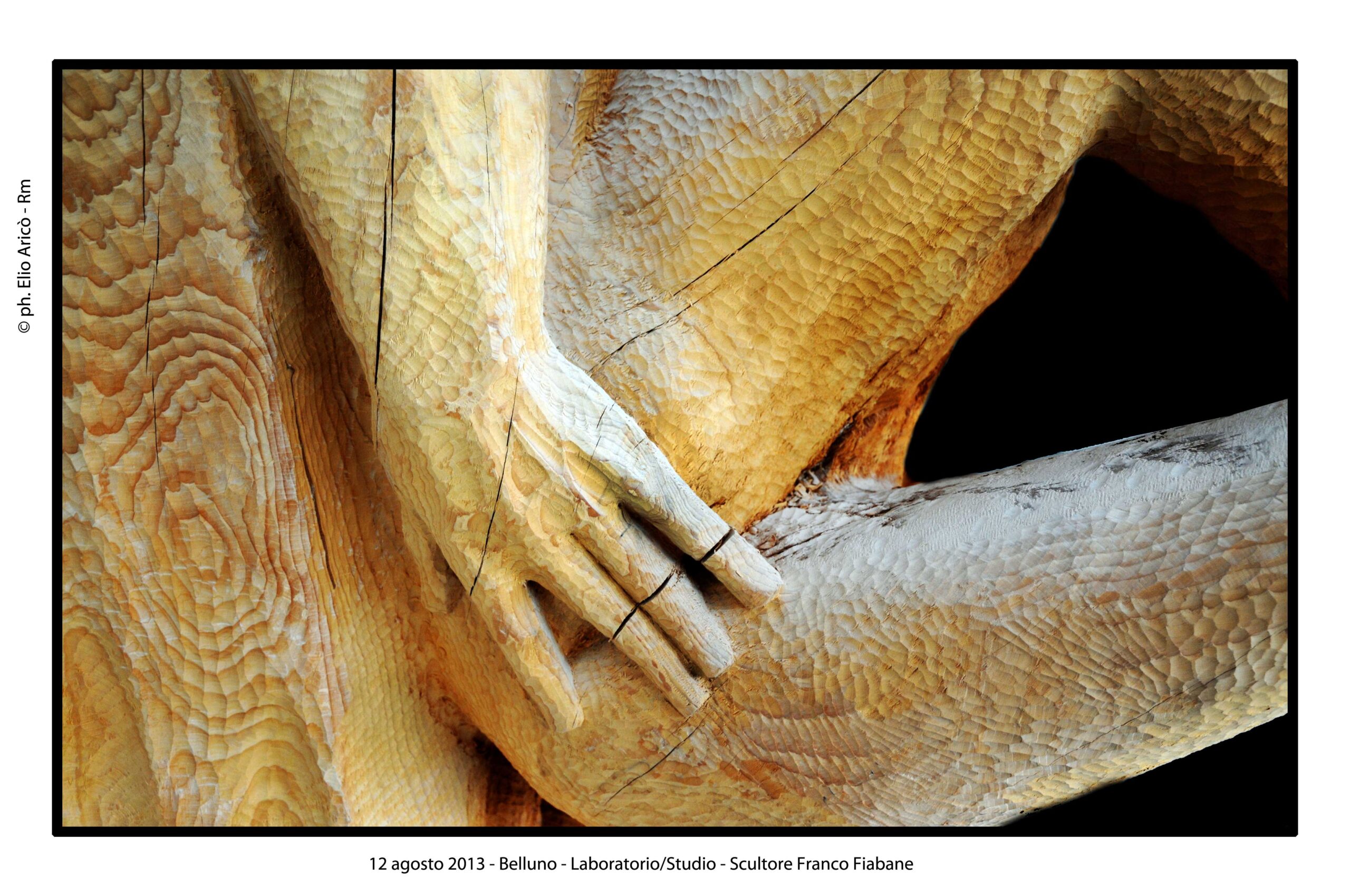 Questa raccolta apre un nuovo capitolo nel racconto dell’opera di Franco Fiabane, affidandosi allo sguardo sensibile e rigoroso delle fotografie di Elio Aricò. Un dialogo silenzioso tra materia e luce, tra gesto creativo e memoria. Il percorso prende avvio dal 2013, anno in cui l’attenzione si concentra sui particolari di una scultura lignea mai portata a compimento: Susanna e i vecchioni. Un’opera di grandi dimensioni, dalla forte presenza fisica e simbolica, collocata per anni in un angolo del laboratorio, come in attesa. La lavorazione, presumibilmente iniziata nel 2003, rivela tutta la complessità del pensiero di Fiabane. Resta il rammarico che Franco, pur avendo più volte espresso il desiderio di completarla, non abbia potuto farlo. Ma Susanna e i vecchioni, così com’è, diventa testimonianza autentica del suo percorso umano e artistico. Non un’opera mancata, bensì un frammento vivo del suo fare arte, capace ancora oggi di emozionare e di raccontare, attraverso i dettagli, l’essenza più profonda della sua scultura.