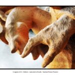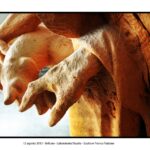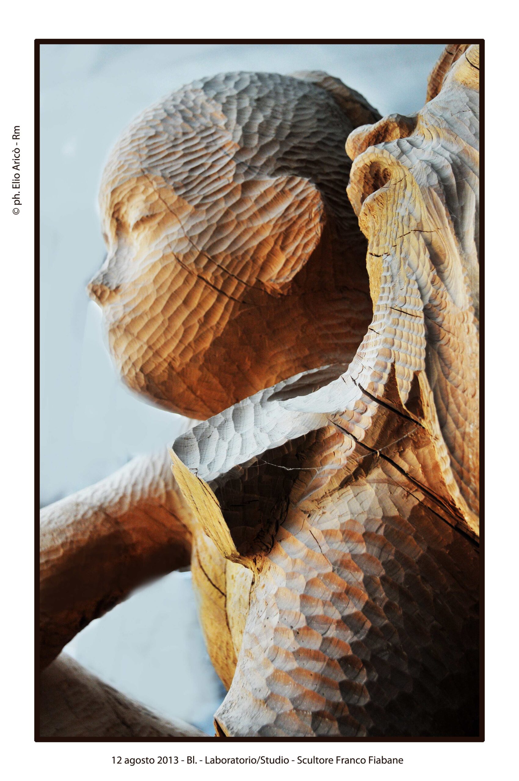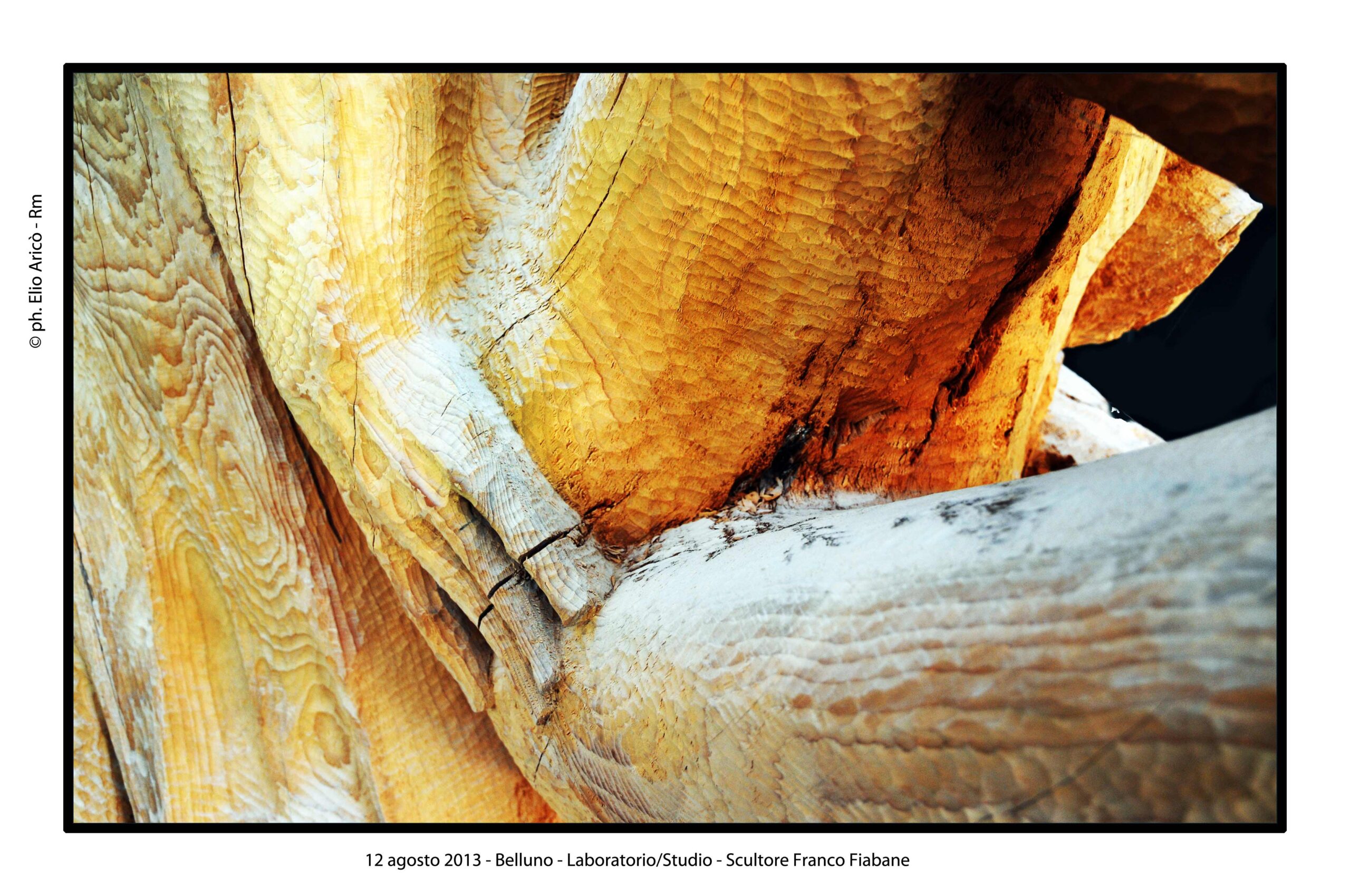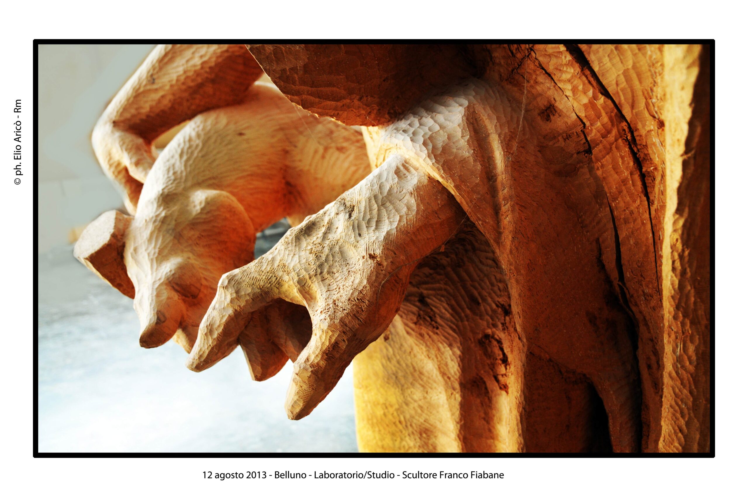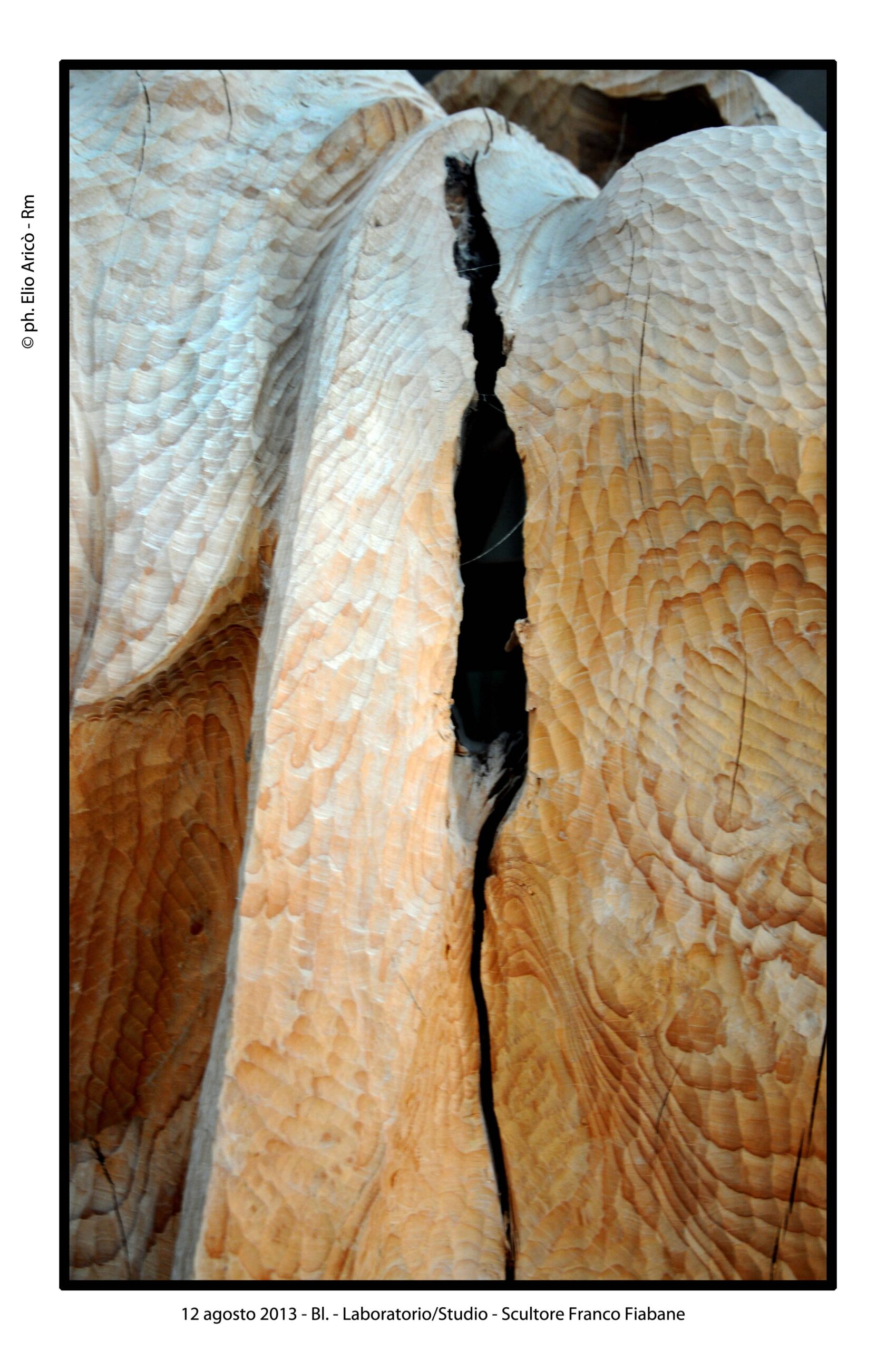 Questa raccolta apre un nuovo capitolo nel racconto dell’opera di Franco Fiabane, affidandosi allo sguardo sensibile e rigoroso delle fotografie di Elio Aricò. Un dialogo silenzioso tra materia e luce, tra gesto creativo e memoria. Il percorso prende avvio dal 2013, anno in cui l’attenzione si concentra sui particolari di una scultura lignea mai portata a compimento: Susanna e i vecchioni. Un’opera di grandi dimensioni, dalla forte presenza fisica e simbolica, collocata per anni in un angolo del laboratorio, come in attesa. La lavorazione, presumibilmente iniziata nel 2003, rivela tutta la complessità del pensiero di Fiabane. Resta il rammarico che Franco, pur avendo più volte espresso il desiderio di completarla, non abbia potuto farlo. Ma Susanna e i vecchioni, così com’è, diventa testimonianza autentica del suo percorso umano e artistico. Non un’opera mancata, bensì un frammento vivo del suo fare arte, capace ancora oggi di emozionare e di raccontare, attraverso i dettagli, l’essenza più profonda della sua scultura.