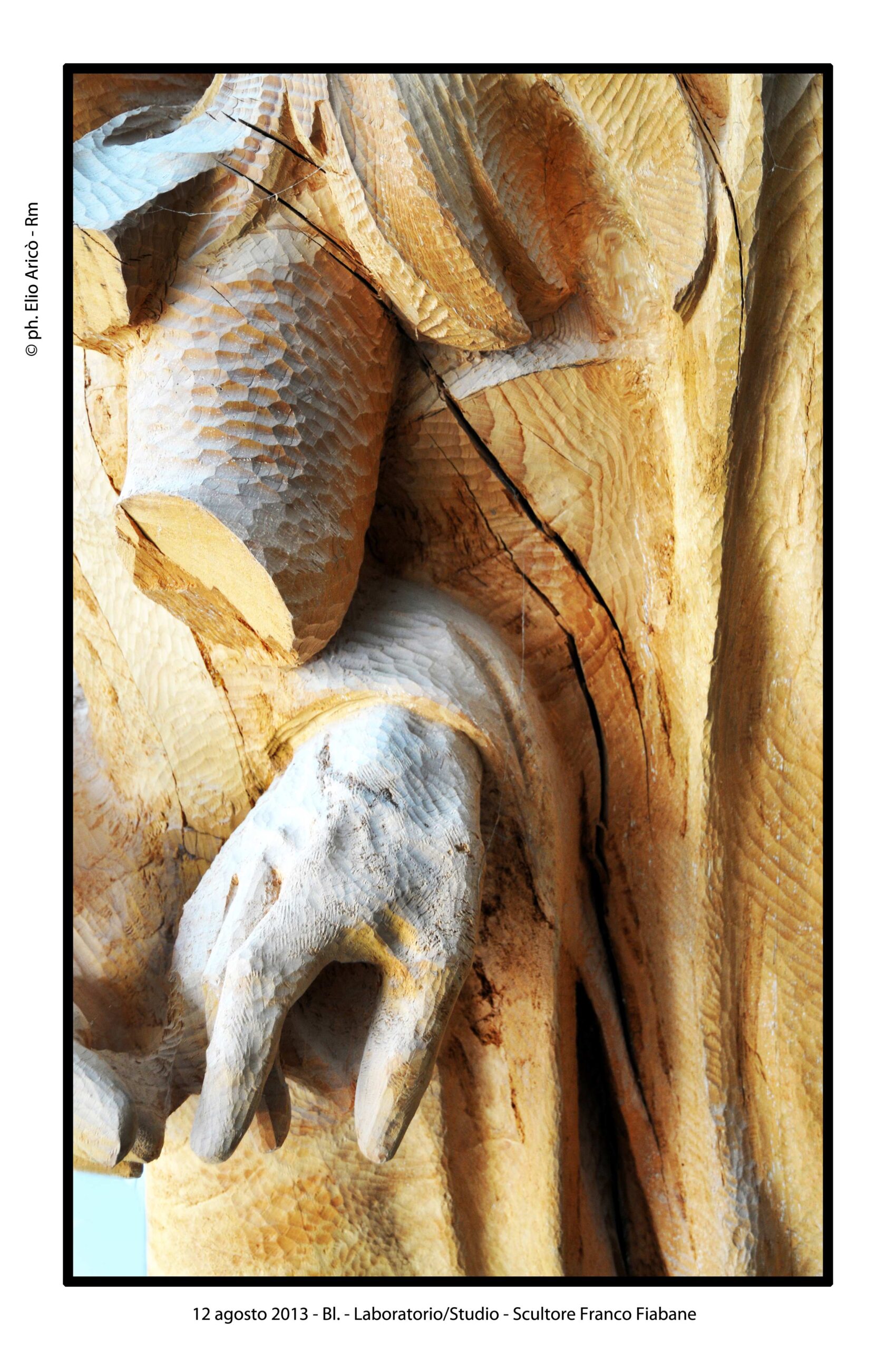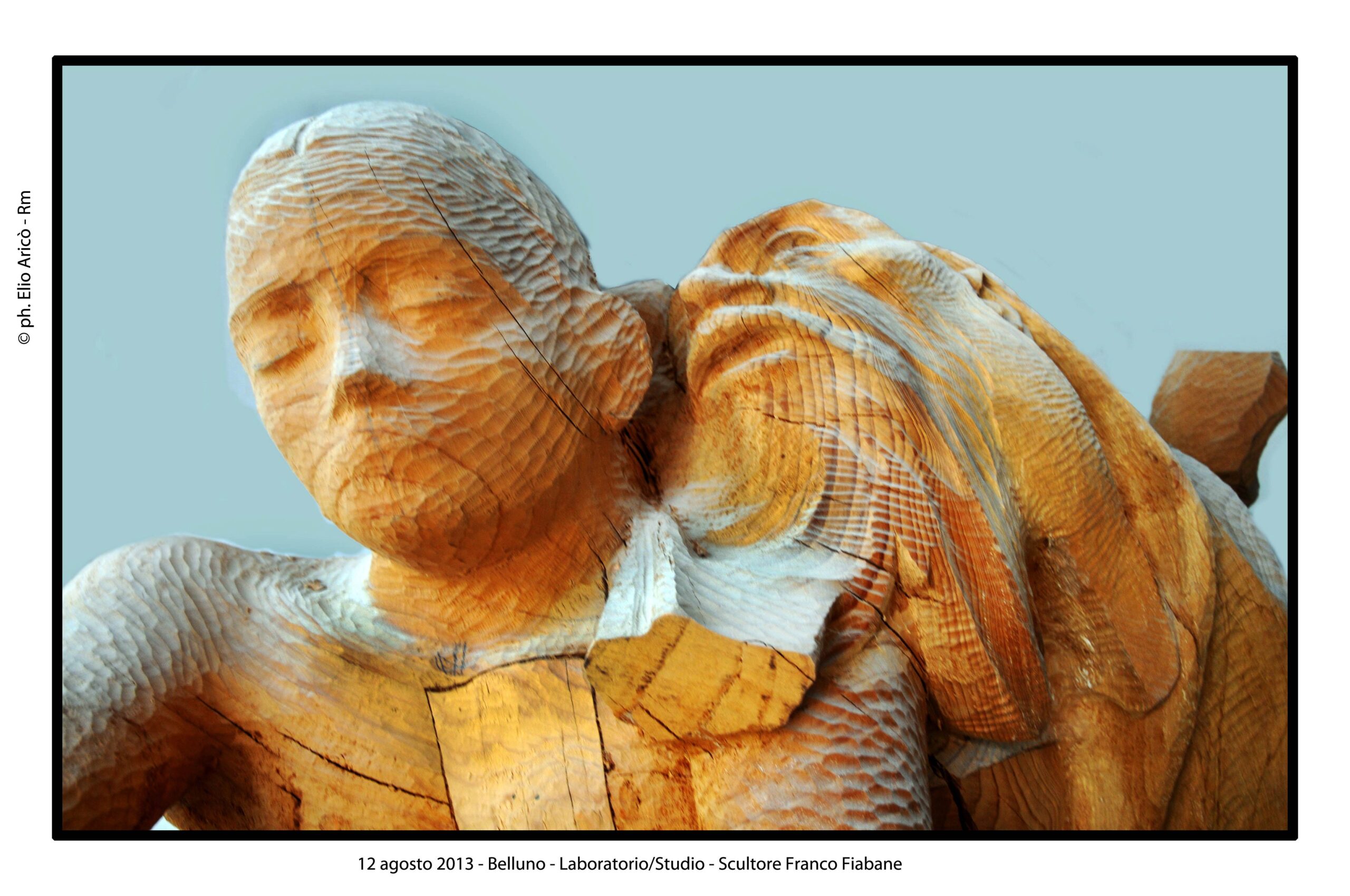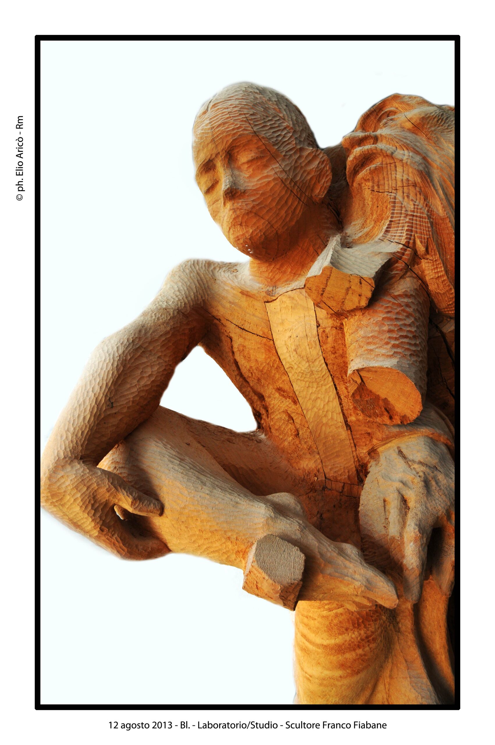 il Cristo deposto è una scultura lignea alla quale Franco Fiabane era profondamente legato. L’opera è stata realizzata nel 2011: la datazione al 2000 riportata nel catalogo è dunque errata e merita una necessaria correzione, importante non solo dal punto di vista archivistico, ma anche per una corretta lettura del percorso artistico dello scultore. Il Cristo deposto rappresenta la più alta e intensa espressione drammatica del dolore che Franco l’artista trasferisce nel legno. È un’opera in cui confluiscono, in modo magistrale, sensibilità umana, studio rigoroso e una straordinaria padronanza del mezzo espressivo. “Franco Fiabane – come ricorda il fotografo-amico Elio Aricò- era infatti estremamente attento all’anatomia umana, oggetto di un’osservazione costante e approfondita nel corso della sua ricerca artistica. In questa scultura egli concentra tutta la sua conoscenza anatomica e la mette al servizio dell’espressione emotiva: il corpo di Cristo non è idealizzato, ma reale, segnato, fragile, profondamente umano”.