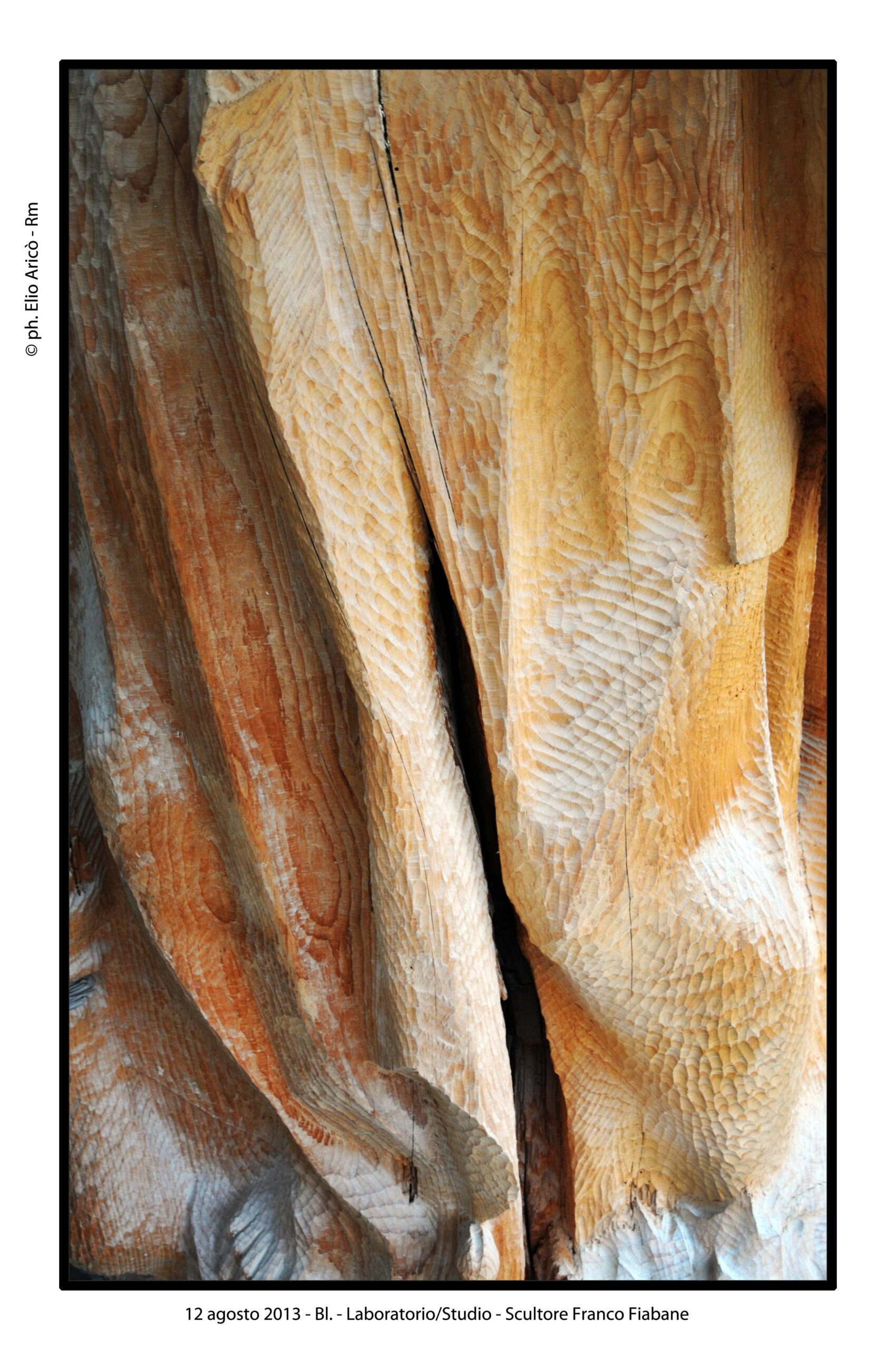Questa raccolta apre un nuovo capitolo nel racconto dell’opera di Franco Fiabane, affidandosi allo sguardo sensibile e rigoroso delle fotografie di Elio Aricò. Un dialogo silenzioso tra materia e luce, tra gesto creativo e memoria. Il percorso prende avvio dal 2013, anno in cui l’attenzione si concentra sui particolari di una scultura lignea mai portata a compimento: Susanna e i vecchioni. Un’opera di grandi dimensioni, dalla forte presenza fisica e simbolica, collocata per anni in un angolo del laboratorio, come in attesa. La lavorazione, presumibilmente iniziata nel 2003, rivela tutta la complessità del pensiero di Fiabane. Resta il rammarico che Franco, pur avendo più volte espresso il desiderio di completarla, non abbia potuto farlo. Ma Susanna e i vecchioni, così com’è, diventa testimonianza autentica del suo percorso umano e artistico. Non un’opera mancata, bensì un frammento vivo del suo fare arte, capace ancora oggi di emozionare e di raccontare, attraverso i dettagli, l’essenza più profonda della sua scultura.