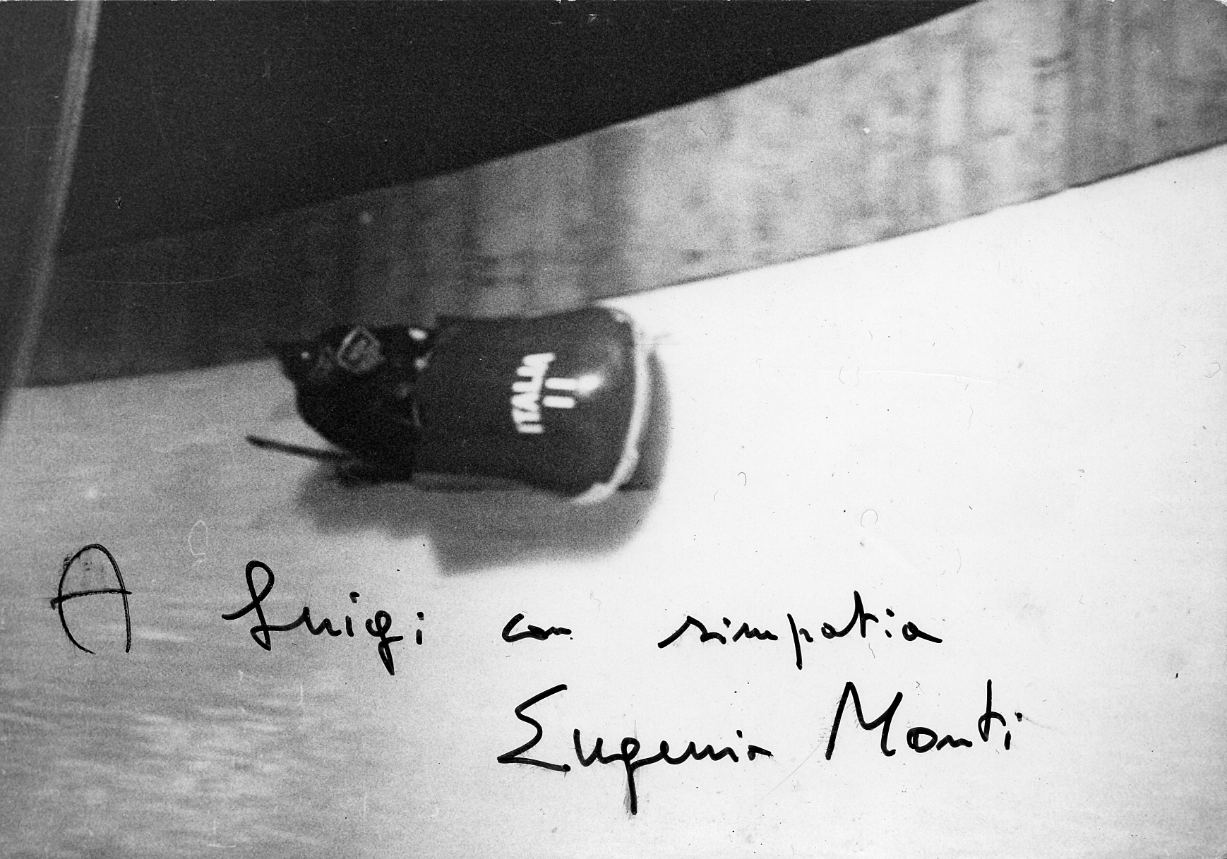 la famosa montagna a confine con l’Italia e la Svizzera , fra Cervinia e Zermatt note località turistiche invernali , ma questo racconto evidenzia soprattutto una storia di emigrazione, lavoro e anche di sport. Otre alle notizie ho raccolto anche delle numerose immagini d’epoca , alcune legate al lavoro della pista, altre con gruppi di persone degli addetti ai lavori assieme anche a campioni mondiali di bob ed altre interamente dedicate alle discese agonistiche dei vari equipaggi. Il Bob è uno sport invernale nel quale delle squadre composte da due o quattro persone eseguono discese cronometrate lungo una pista ghiacciata a bordo di un mezzo dotato di pattini sterzanti, spinto all’avvio dai membri della squadra e successivamente dalla forza di gravità. Tale disciplina sportiva fu avviata negli anni 1880 ad Albany (New York) e successivamente introdotto in Svizzera; le prime gare venivano disputate su strade coperte di neve. In Italia nel 1920 fu fondato a Cortina d’Ampezzo (BL) il primo Bob Club d’Italia e sulla strada di Passo Falzarego si organizzò nel 1922 il primo Campionato Italiano. Infatti in cadore era molto sentita questa attività agonistica e si svolgevano nel passato diverse gare di BOB su strada anche a livello amatoriale , posso ricordare il gruppo sportivo denominato Aquilotti di Pelos oppure le varie gare disputate nel Comune di laggio di Cadore alle quali ho anche assistito personalmente nella mia infanzia. Nel 1923 venne costruita per opera di Raffaele Zardini la pista di Ronco, mantenuta operativa e ampliata in occasione dei Giochi Olimpici del 1956 fino alla sua chiusura definitiva nel 2008. La pista di Cortina in origine aveva una lunghezza di mt. 1.740 poi ridimensionata fino ad una lunghezza di mt. 1.350, un dislivello di 120 mt. dove il bob può raggiungere facilmente una velocità di 130 Km orari . La pista era dotata di rettifili e 15 curve fra le quali: Lastries-Controcurva-Verzi e Sento, I, II, III Labirinto, Curva Belvedere, Bandion, Antelao, Cristallo,Valletta e Curva di arrivo. I primi bob erano costruiti interamente in legno, mentre i bob moderni sono in lega di metallo leggero, con pattini in acciaio e carrozzerie aerodinamiche; devono avere una lunghezza massima di mt.3.80 per il Bob a 4 e di m 2.7 per il Bob a 2. La larghezza massima è di mt. 0,67 ed il peso totale compreso l’equipaggio è di Kg. 630 per il Bob a 4 e 390 Kg. per il Bob a 2. Per la forza di gravità, quanto maggiore è il peso e più veloce è il mezzo; il bobbista deve possedere una capacità di spinta e di velocità notevoli, abbinata a una massa corporea imponente per la trasmissione al mezzo della massima quantità di moto e di velocità, infatti i bobisti attuali provengono dalla atletica leggera , altleti che corrono i cento e i duecento metri piani, dotati di grande velocità e di peso corporeo. La grande stagione del Bob Italiano fu quella degli anni ’50 e ’60: ne fu protagonista Eugenio Monti originario di Aurozo di Cadore, prima grande sciatore , campione italiano di slalom gigante e slalom speciale negli anni 1949 e 50 poi in seguito ad una caduta ottimo bobista vincendo 9 campionati mondiali e 6 medaglie olimpiche insieme a Renzo Alverà e successivamente a Sergio Siorpaes, ma la medaglia più importante fu vinta alle olompiadi di INNSBRUCH nel 1964 in quanto con un gesto di grande sportività egli prestò un bullone del suo BOB all’equipaggio Inglese che l’aveva rotto.