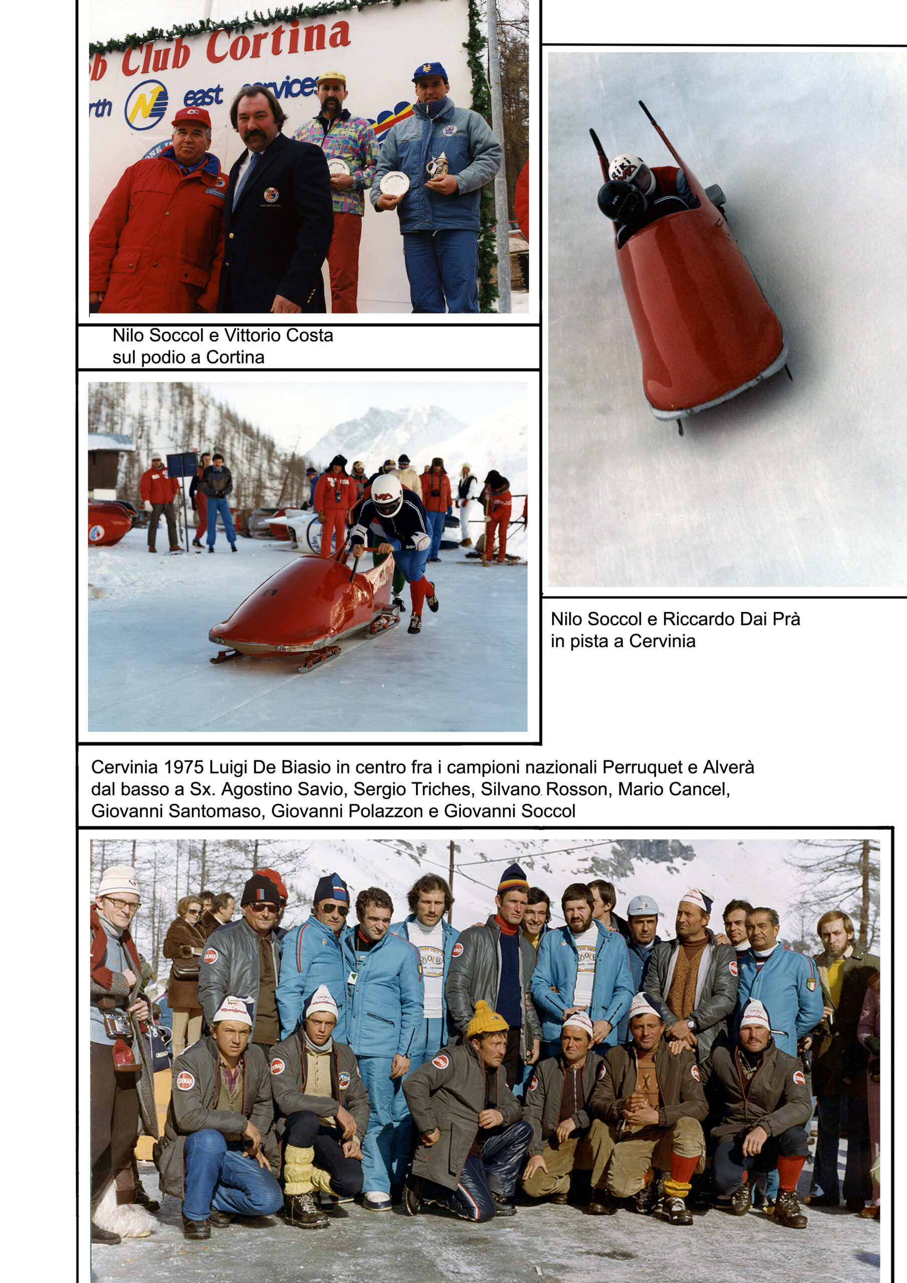 Di questi atleti coraggiosi per affrontare una disciplina sportiva così audace e pericolosa capaci di scendere a velocità che talvolta superano i 140 km all’ora si deve assolutamente sottolineare che Paolo Costa di Canale D’Agordo vinse a Cervinia una gara di Coppa del Mondo nel gennaio del 1983 ( con equipaggio di Bob a 4 – Ermenegildo Sartore pilota , interni Paolo Costa e Onorio Marocchi, frenatore Pasquale Gesuito) famosi bobisti a livello mondiale e che – soprattutto – il veterano Nillo Soccol ha partecipato a numerose gare dei Campionati Veneti e Italiani e di Coppa Europa di Bob, sia a Cortina che a Cervinia, salendo numerose volte sul podio. Il Soccol mi ha raccontato diversi aneddoti avendo fatto nella sua carriera oltre tremila discese, anche fasciato con le costole rotte , oppure una volta a Cervinia il suo frenatore Riccardo Dai Prà di Taibon , a causa del frastuono e della velocità non capì l’ordine di frenare e quindi il BOB proseguì la sua corsa anche dopo il traguardo a 130 km orari e si andò a conficcare in un mucchio di neve alla fine di una salita realizzata apposta per la dissipazione della velocità. Andò diversamente all’equipaggio Giapponese subito dopo poiché continuò la corsa fino a schiantarsi sulla strada statale sottostante, fortunatamente solo con alcune contusioni da parte degli atleti giapponesi. Sono note e riflessioni che ci insegnano la capacità di questi Agordini nell’inventarsi un’attività anche per il periodo invernale: muratori e carpentieri con grande esperienza, giovani alle prime armi, in luoghi di lavoro proibitivi, a 2000 metri di altitudine ed in condizioni disagiate, magari a parecchi gradi sotto lo zero e con bufere di neve. Probabilmente negli anni sessanta non esistevano ammortizzatori sociali o cassa integrazione e pertanto era fondamentale avere una occupazione anche nel periodo invernale. Posso proprio dire di aver raccontato una storia sconosciuta di emigrazione dalle Dolomiti al Cervino, importante dal punto di vista economico-professionale e di assoluta visibilità internazionale. Oggi, nonostante le grandi splendide prestazioni degli anni ’60 e ’70 dei bobisti italiani con un medagliere di tutto rispetto, purtroppo tutto questo è finito e in Italia non vi sono più piste di bob attive anche se sono passati pochi anni dalle Olimpiadi di Torino disputate nel 2006: le squadre di bob infatti, devono andare ad allenarsi in Austria con tutti i relativi disagi e costi. La pista di CESANA località dove sono state disputate le le gare di BOB alle olimpiadi di Torino , è costata 20 milioni di euro, terminate le olimpiadi è stata chiusa per impraticabilità , questioni di sicurezza.