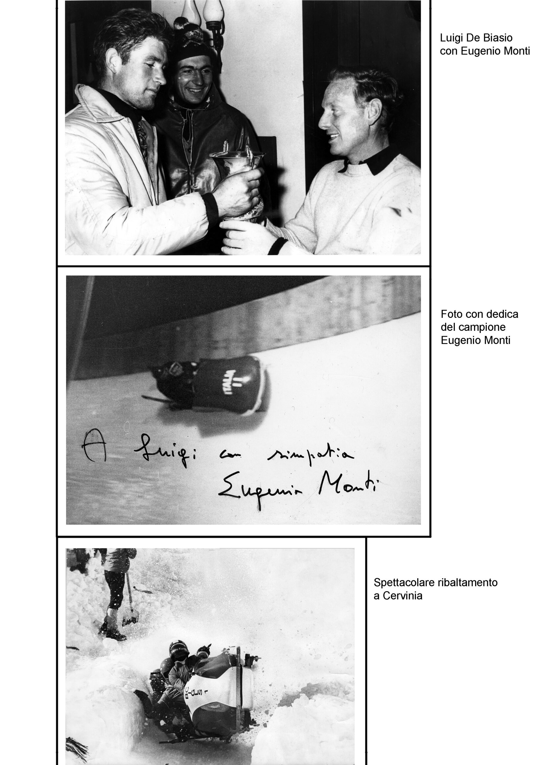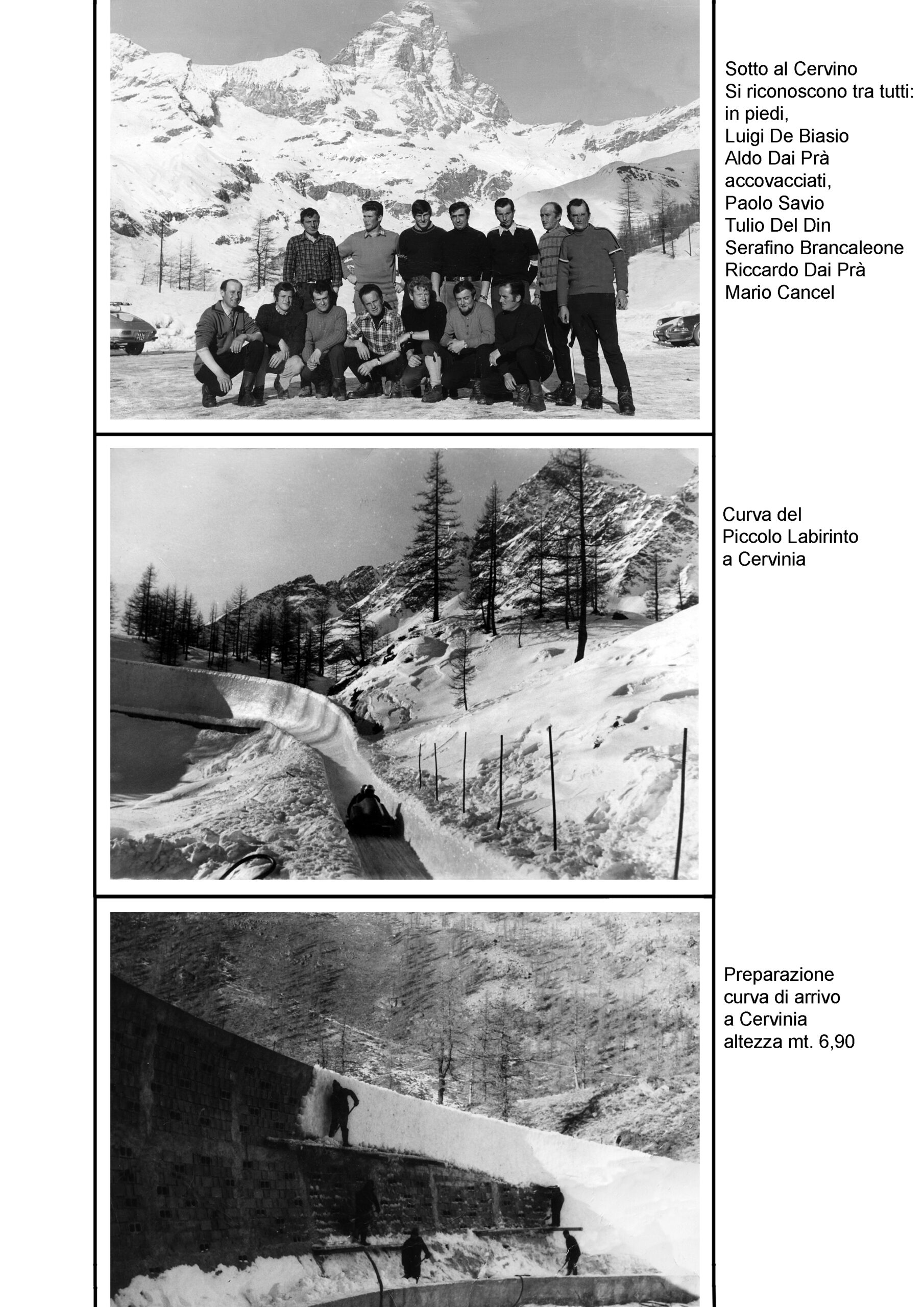 Nel 1964 un nutrito gruppo di Agordini lavorarono nella stagione invernale a Breuil-Cervinia per la preparazione e la manutenzione della pista di bob: all’inizio sotto le direttive della impresa Dal Pont e successivamente coordinati da Luigi De Biasio originario di Voltago Agordino e poi residente a Taibon Agordino fin dal 1970 avendo sposato Renata Savio . Luigi De Biasio ha lavorato a Cervinia per 14 stagioni consecutive (dal ’64 fino all’inverno 77/78) negli anni in cui si svolsero 2 Campionati Mondiali (1971-1975) e diversi Campionati Italiani ed Europei e Campionati Mondiali Militari, competizioni ad altissimo livello. Nella sua scatola di ricordi, conserva gelosamente fotografie, articoli di giornale, distintivi, gagliardetti, autografi di campioni internazionali e dediche. In particolare ho trovato un ritaglio di un quotidiano della Valle d’Aosta del 1975 per mè molto significativo che mi emoziona ogni qualvolta che lo leggo ,e cita testualmente :