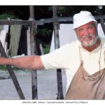 Nel suo laboratorio il tempo sembra rallentare, seguendo il ritmo paziente delle mani e del legno. Le immagini raccontano Franco Fiabane al lavoro nell’estate del 2011: uno scultore immerso nel dialogo silenzioso con la materia, circondato da trucioli, attrezzi e forme che nascono poco alla volta. Nel laboratorio si vedono opere in diverse fasi di lavorazione: grandi tronchi appena sbozzati, figure ancora incomplete, parti separate – braccia, busti, rilievi – che attendono di essere ricomposte o rifinite. Accanto alle sculture tridimensionali compaiono pannelli scolpiti a bassorilievo, scene narrative che richiamano il racconto popolare, la memoria collettiva, la vita quotidiana. È un mondo coerente, in cui il gesto artigianale si intreccia alla dimensione simbolica. Le fotografie di Elio Arico’ mostrano Fiabane concentrato, a volte sorridente, a volte assorto. Indossa il grembiule da lavoro, osserva l’opera da vicino, la tocca, la gira, come per verificarne l’equilibrio e l’anima. Il rapporto con il legno è fisico e diretto: martello e scalpello diventano strumenti di dialogo più che di forza, capaci di seguire le venature naturali del materiale e assecondarne le imperfezioni.