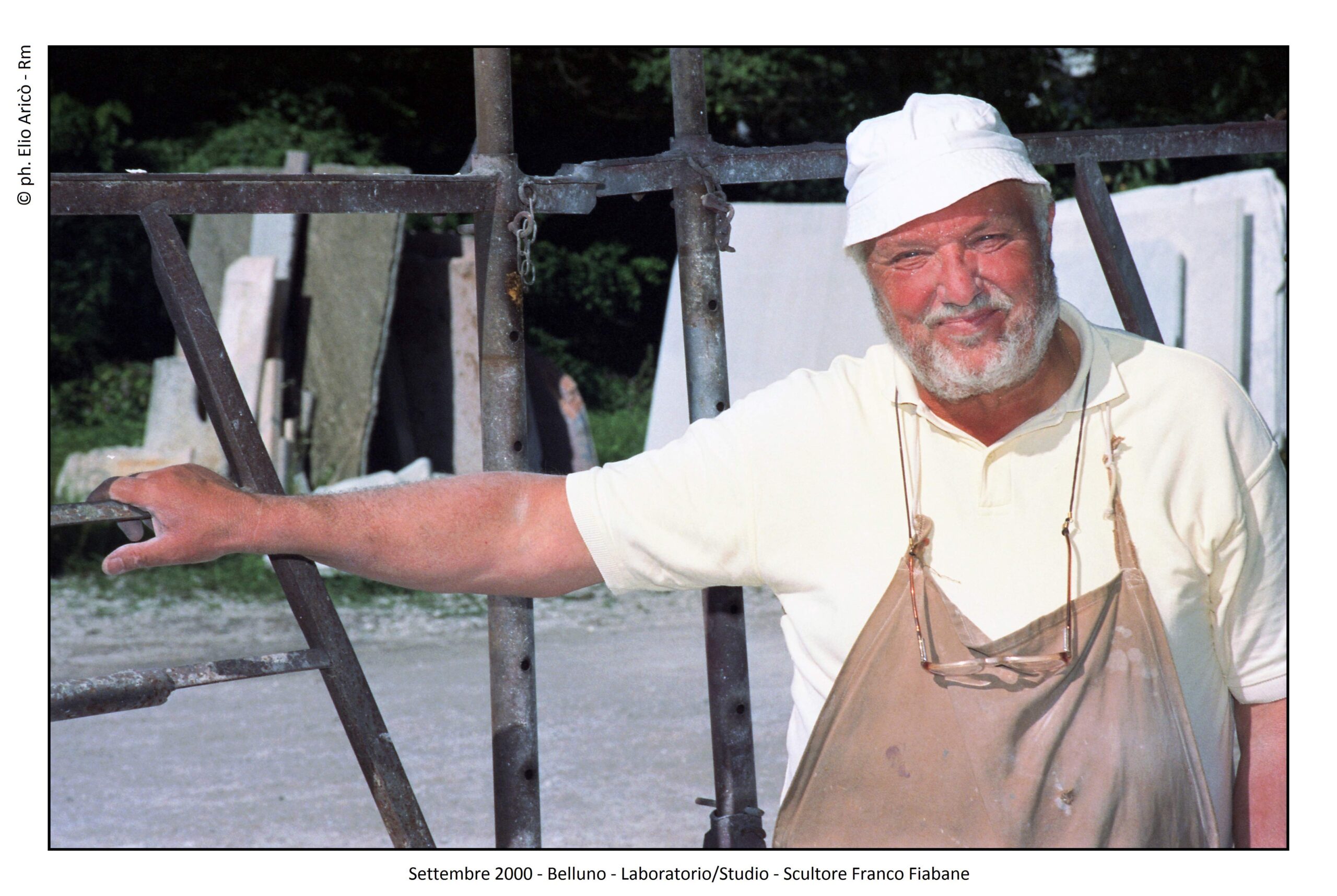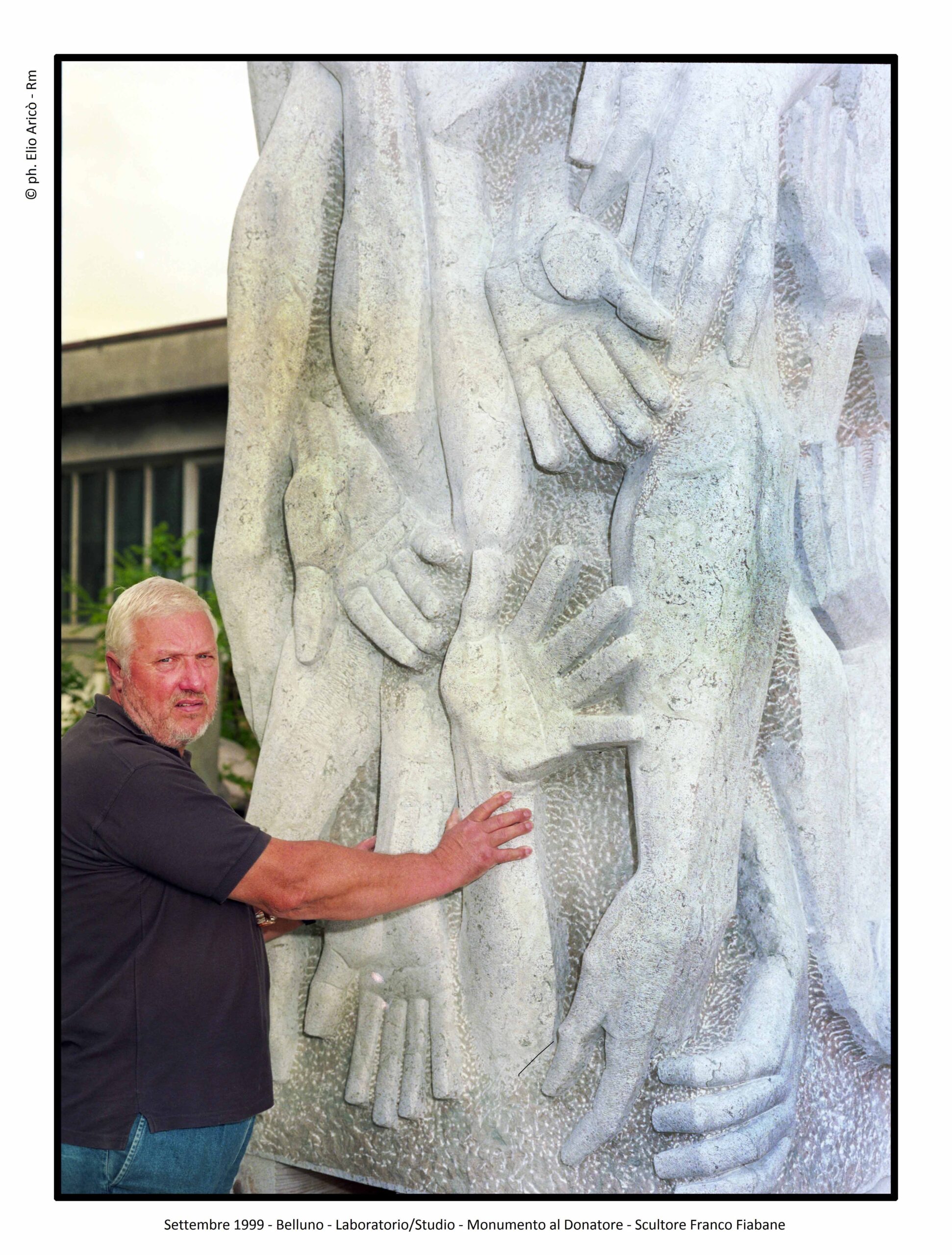 Nel settembre del 1999, nel laboratorio di Belluno, lo scultore Franco Fiabane è ritratto accanto alla gigantesca stele del Monumento al Donatore, ormai prossima all’installazione. Lo scatto di Elio Aricò coglie un momento di intensa concentrazione: l’artista è da poco intervenuto, con scalpello e mazzuolo sugli ultimi dettagli della superficie di pietra, dialogando fisicamente con la materia, ora accarezza la sua opera e la guarda con orgogliosa soddisfazione. L’opera si caratterizza per un potente intreccio di mani e braccia protese verso l’alto. Questo groviglio plastico diventa simbolo universale di solidarietà, dono e aiuto reciproco, valori fondanti dell’intero monumento. La presenza dello scultore accanto alla sua creazione non è casuale: la figura umana serve a restituire la scala monumentale della stele, enfatizzandone la forza espressiva e l’impatto visivo. La fotografia è stata pubblicata nel catalogo curato dal prof. Carlo Cavalli (pag. 34), contribuendo a documentare una fase cruciale del processo creativo dell’opera.