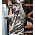 Nel settembre del 1999, nel laboratorio di Belluno, lo scultore Franco Fiabane è ritratto accanto alla gigantesca stele del Monumento al Donatore, ormai prossima all’installazione. Lo scatto di Elio Aricò coglie un momento di intensa concentrazione: l’artista è da poco intervenuto, con scalpello e mazzuolo sugli ultimi dettagli della superficie di pietra, dialogando fisicamente con la materia, ora accarezza la sua opera e la guarda con orgogliosa soddisfazione. L’opera si caratterizza per un potente intreccio di mani e braccia protese verso l’alto. Questo groviglio plastico diventa simbolo universale di solidarietà, dono e aiuto reciproco, valori fondanti dell’intero monumento. La presenza dello scultore accanto alla sua creazione non è casuale: la figura umana serve a restituire la scala monumentale della stele, enfatizzandone la forza espressiva e l’impatto visivo. La fotografia è stata pubblicata nel catalogo curato dal prof. Carlo Cavalli (pag. 34), contribuendo a documentare una fase cruciale del processo creativo dell’opera.