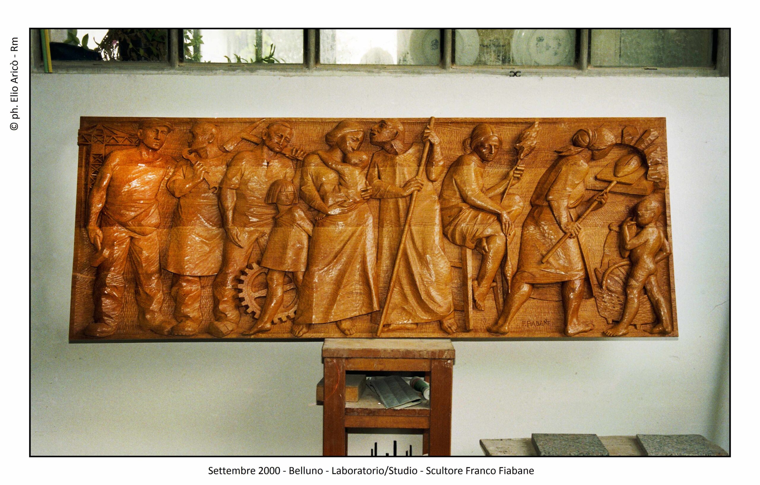 Nel suo laboratorio il tempo sembra rallentare, seguendo il ritmo paziente delle mani e del legno. Le immagini raccontano Franco Fiabane al lavoro nell’estate del 2011: uno scultore immerso nel dialogo silenzioso con la materia, circondato da trucioli, attrezzi e forme che nascono poco alla volta. Nel laboratorio si vedono opere in diverse fasi di lavorazione: grandi tronchi appena sbozzati, figure ancora incomplete, parti separate – braccia, busti, rilievi – che attendono di essere ricomposte o rifinite. Accanto alle sculture tridimensionali compaiono pannelli scolpiti a bassorilievo, scene narrative che richiamano il racconto popolare, la memoria collettiva, la vita quotidiana. È un mondo coerente, in cui il gesto artigianale si intreccia alla dimensione simbolica. Le fotografie di Elio Arico’ mostrano Fiabane concentrato, a volte sorridente, a volte assorto. Indossa il grembiule da lavoro, osserva l’opera da vicino, la tocca, la gira, come per verificarne l’equilibrio e l’anima. Il rapporto con il legno è fisico e diretto: martello e scalpello diventano strumenti di dialogo più che di forza, capaci di seguire le venature naturali del materiale e assecondarne le imperfezioni.