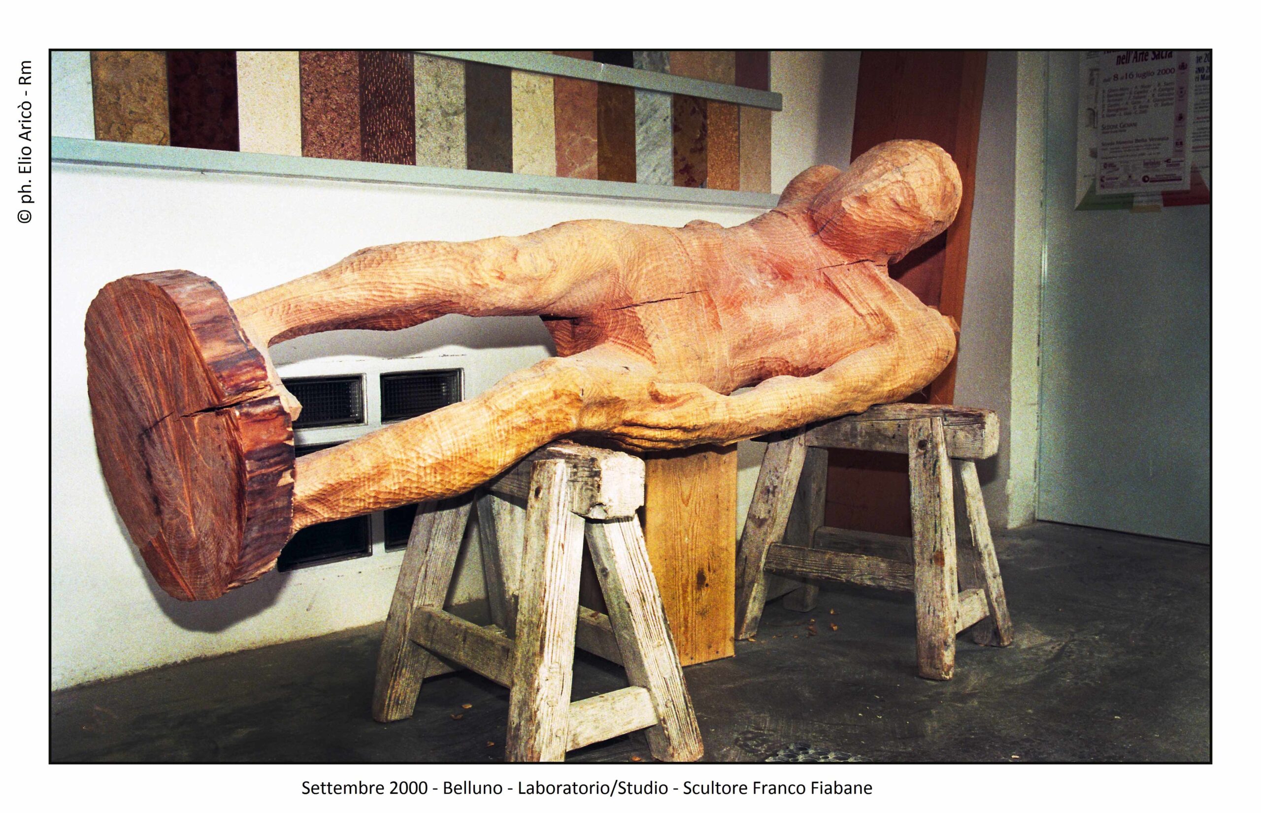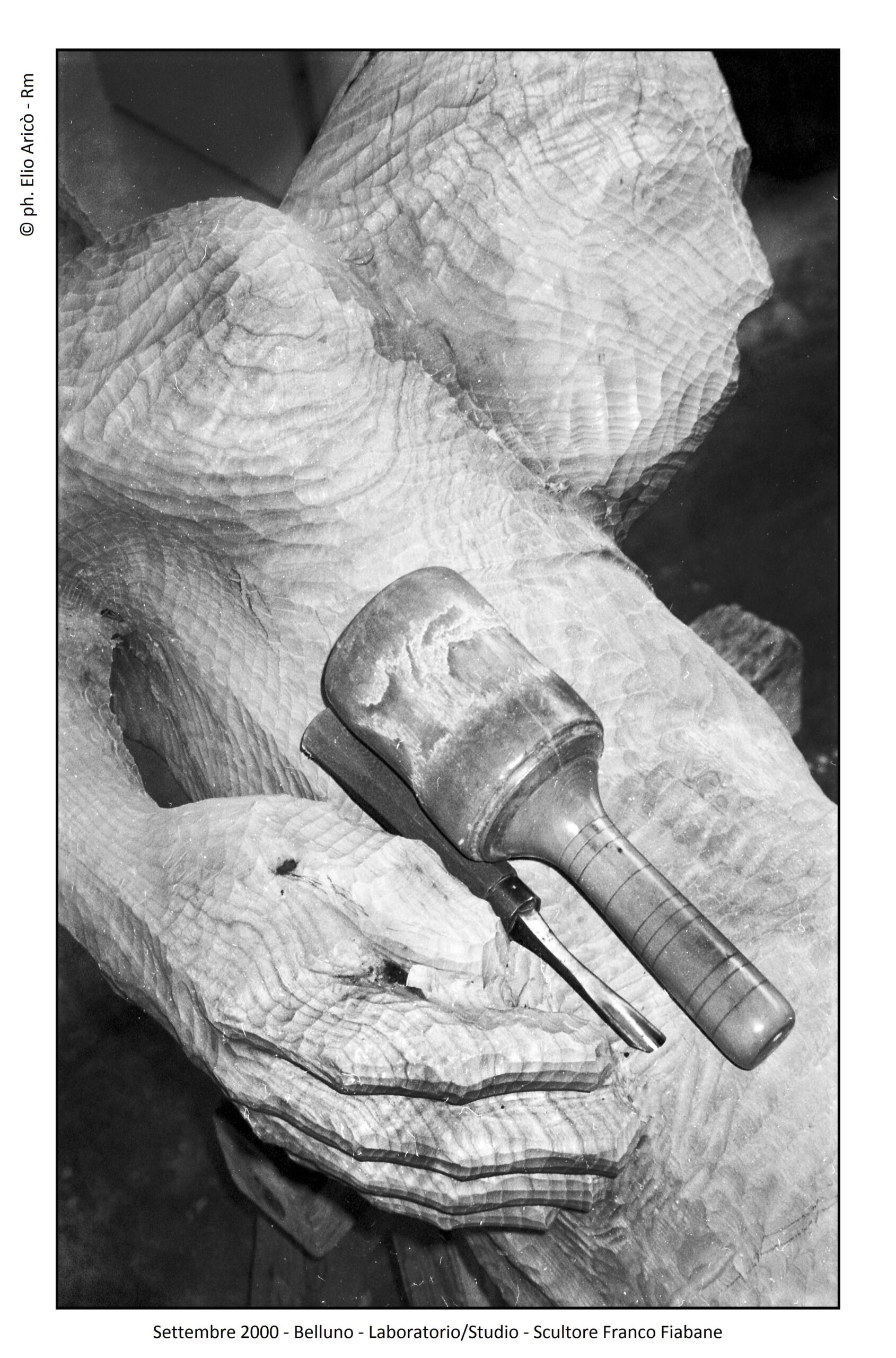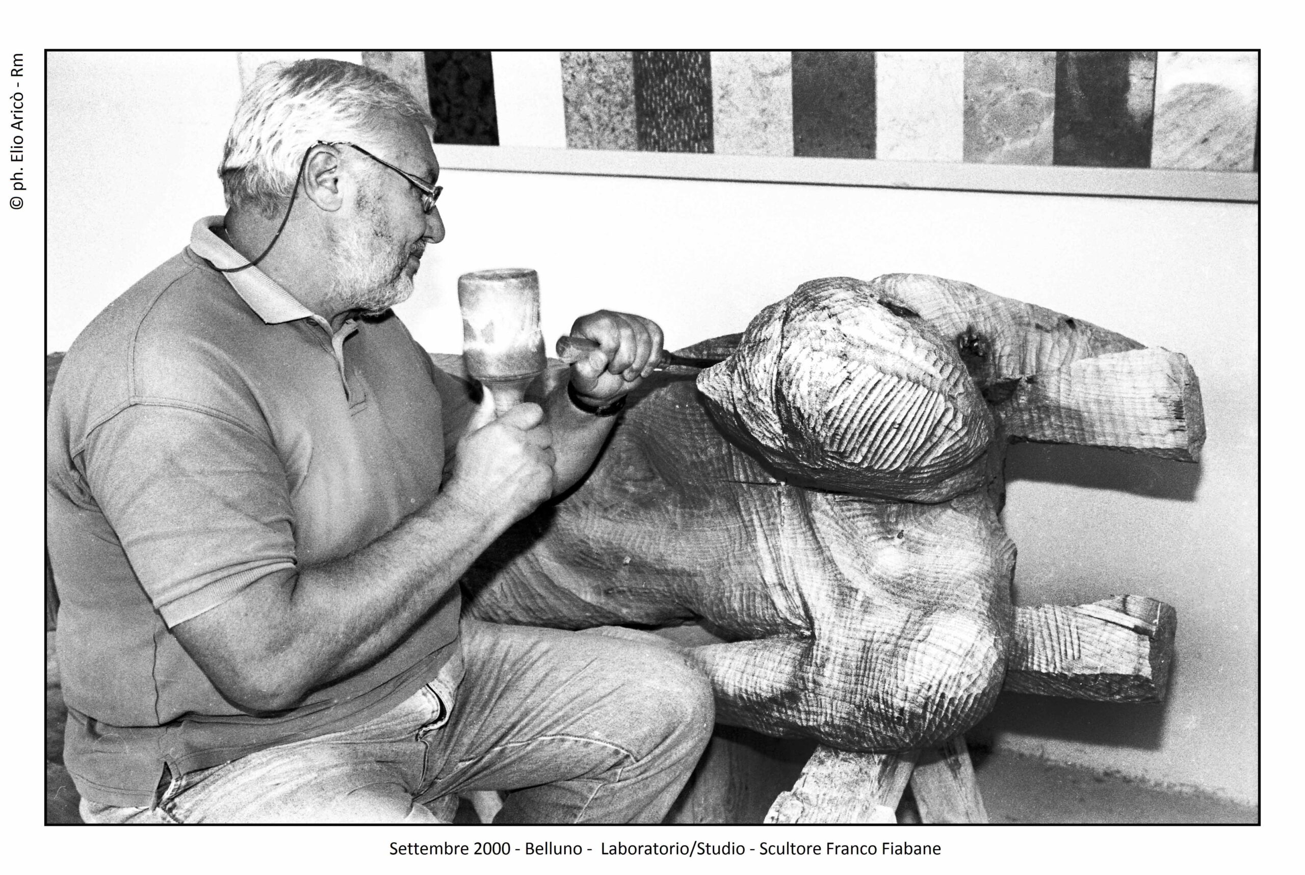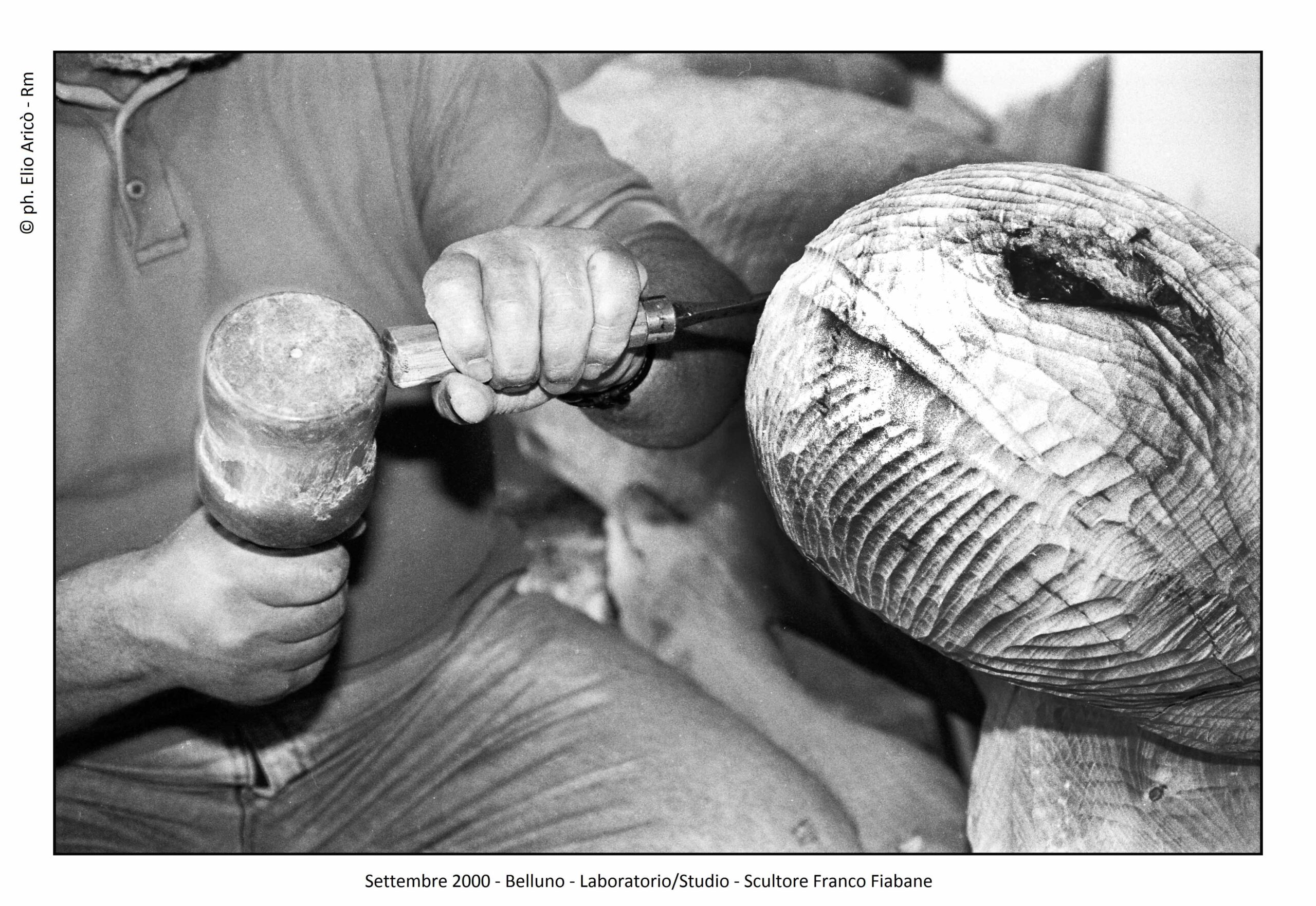 Le immagini di Elio Aricò raccontano non solo l’opera compiuta, ma anche il processo creativo: Fiabane colto nel gesto lento e concentrato dell’incisione, mentre definisce i volumi, leviga, approfondisce le ombre. È uno sguardo intimo dentro il laboratorio dell’artista, dove la scultura prende forma attraverso il rapporto fisico con il legno.