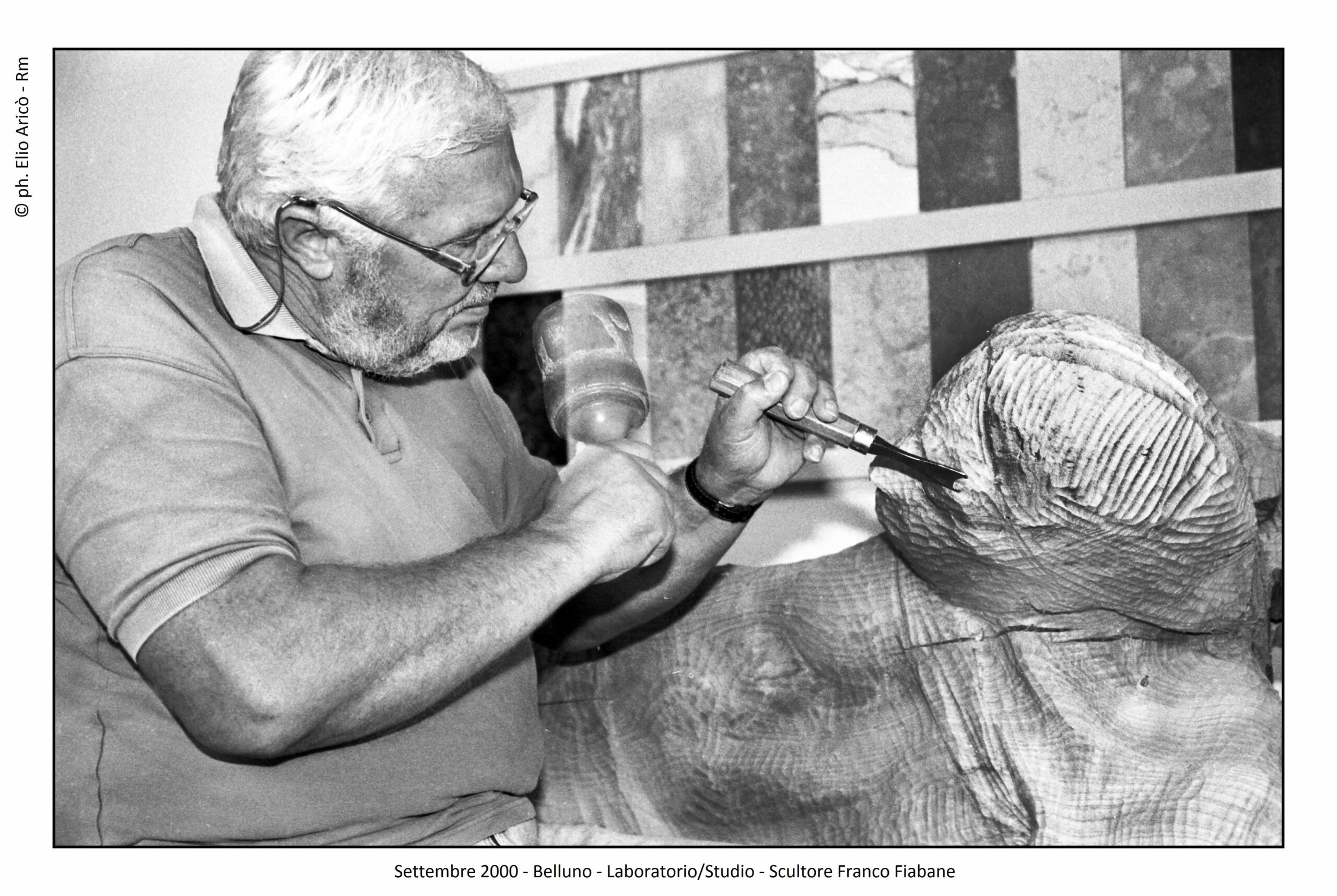 Nel 1996 il fotografo Elio Aricò realizzò una serie di scatti dedicati all’amico artista Franco Fiabane, immortalato durante alcune giornate trascorse nella sua casa di vacanza immersa nei boschi del Nevegal. Un luogo appartato, raggiungibile percorrendo una strada sterrata tra il verde, dove l’artista trovava tranquillità e ispirazione. Le immagini, scattate tra luglio e settembre, raccontano un Fiabane al lavoro anche lontano dallo studio. La veranda della casa si trasformava infatti in un vero e proprio laboratorio all’aperto: sul tavolo si accumulavano sgorbie e strumenti per la lavorazione del legno, mentre l’artista continuava a scolpire e progettare nuove opere. Accanto a lui, presenza discreta e costante, la moglie Maria, testimone quotidiana di un lavoro creativo che non conosceva pause nemmeno durante le vacanze. Gli scatti di Aricò restituiscono così un ritratto autentico dell’artista, colto nella dimensione più intima del suo lavoro, tra natura, silenzio e passione per l’arte.