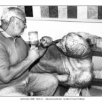 Nel settembre del 1999, nel laboratorio di Belluno, lo scultore Franco Fiabane è ritratto accanto alla gigantesca stele del Monumento al Donatore, ormai prossima all’installazione. Lo scatto di Elio Aricò coglie un momento di intensa concentrazione: l’artista è da poco intervenuto, con scalpello e mazzuolo sugli ultimi dettagli della superficie di pietra, dialogando fisicamente con la materia, ora accarezza la sua opera e la guarda con orgogliosa soddisfazione. L’opera si caratterizza per un potente intreccio di mani e braccia protese verso l’alto. Questo groviglio plastico diventa simbolo universale di solidarietà, dono e aiuto reciproco, valori fondanti dell’intero monumento. La presenza dello scultore accanto alla sua creazione non è casuale: la figura umana serve a restituire la scala monumentale della stele, enfatizzandone la forza espressiva e l’impatto visivo. La fotografia è stata pubblicata nel catalogo curato dal prof. Carlo Cavalli (pag. 34), contribuendo a documentare una fase cruciale del processo creativo dell’opera.