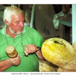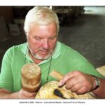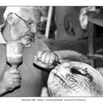 Nel suo laboratorio il tempo sembra rallentare, seguendo il ritmo paziente delle mani e del legno. Le immagini raccontano Franco Fiabane al lavoro nell’estate del 2011: uno scultore immerso nel dialogo silenzioso con la materia, circondato da trucioli, attrezzi e forme che nascono poco alla volta. Nel laboratorio si vedono opere in diverse fasi di lavorazione: grandi tronchi appena sbozzati, figure ancora incomplete, parti separate – braccia, busti, rilievi – che attendono di essere ricomposte o rifinite. Accanto alle sculture tridimensionali compaiono pannelli scolpiti a bassorilievo, scene narrative che richiamano il racconto popolare, la memoria collettiva, la vita quotidiana. È un mondo coerente, in cui il gesto artigianale si intreccia alla dimensione simbolica. Le fotografie di Elio Arico’ mostrano Fiabane concentrato, a volte sorridente, a volte assorto. Indossa il grembiule da lavoro, osserva l’opera da vicino, la tocca, la gira, come per verificarne l’equilibrio e l’anima. Il rapporto con il legno è fisico e diretto: martello e scalpello diventano strumenti di dialogo più che di forza, capaci di seguire le venature naturali del materiale e assecondarne le imperfezioni.