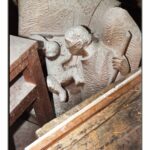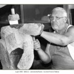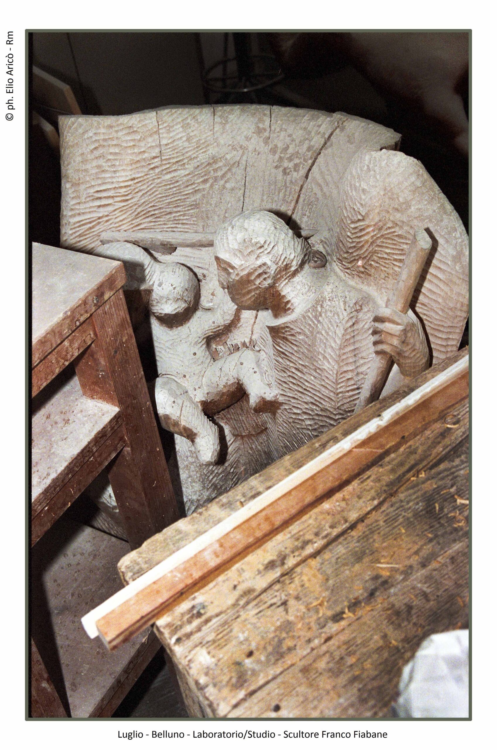 Nel suo laboratorio il tempo sembra rallentare, seguendo il ritmo paziente delle mani e del legno. Le immagini raccontano Franco Fiabane al lavoro nell’estate del 2011: uno scultore immerso nel dialogo silenzioso con la materia, circondato da trucioli, attrezzi e forme che nascono poco alla volta. Nel laboratorio si vedono opere in diverse fasi di lavorazione: grandi tronchi appena sbozzati, figure ancora incomplete, parti separate – braccia, busti, rilievi – che attendono di essere ricomposte o rifinite. Accanto alle sculture tridimensionali compaiono pannelli scolpiti a bassorilievo, scene narrative che richiamano il racconto popolare, la memoria collettiva, la vita quotidiana. È un mondo coerente, in cui il gesto artigianale si intreccia alla dimensione simbolica. Le fotografie di Elio Arico’ mostrano Fiabane concentrato, a volte sorridente, a volte assorto. Indossa il grembiule da lavoro, osserva l’opera da vicino, la tocca, la gira, come per verificarne l’equilibrio e l’anima. Il rapporto con il legno è fisico e diretto: martello e scalpello diventano strumenti di dialogo più che di forza, capaci di seguire le venature naturali del materiale e assecondarne le imperfezioni.