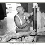 Nel 1996 il fotografo Elio Aricò realizzò una serie di scatti dedicati all’amico artista Franco Fiabane, immortalato durante alcune giornate trascorse nella sua casa di vacanza immersa nei boschi del Nevegal. Un luogo appartato, raggiungibile percorrendo una strada sterrata tra il verde, dove l’artista trovava tranquillità e ispirazione. Le immagini, scattate tra luglio e settembre, raccontano un Fiabane al lavoro anche lontano dallo studio. La veranda della casa si trasformava infatti in un vero e proprio laboratorio all’aperto: sul tavolo si accumulavano sgorbie e strumenti per la lavorazione del legno, mentre l’artista continuava a scolpire e progettare nuove opere. Accanto a lui, presenza discreta e costante, la moglie Maria, testimone quotidiana di un lavoro creativo che non conosceva pause nemmeno durante le vacanze. Gli scatti di Aricò restituiscono così un ritratto autentico dell’artista, colto nella dimensione più intima del suo lavoro, tra natura, silenzio e passione per l’arte.
