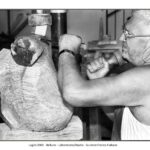 Nel settembre del 1999, nel laboratorio di Belluno, lo scultore Franco Fiabane è ritratto accanto alla gigantesca stele del Monumento al Donatore, ormai prossima all’installazione. Lo scatto di Elio Aricò coglie un momento di intensa concentrazione: l’artista è da poco intervenuto, con scalpello e mazzuolo sugli ultimi dettagli della superficie di pietra, dialogando fisicamente con la materia, ora accarezza la sua opera e la guarda con orgogliosa soddisfazione. L’opera si caratterizza per un potente intreccio di mani e braccia protese verso l’alto. Questo groviglio plastico diventa simbolo universale di solidarietà, dono e aiuto reciproco, valori fondanti dell’intero monumento. La presenza dello scultore accanto alla sua creazione non è casuale: la figura umana serve a restituire la scala monumentale della stele, enfatizzandone la forza espressiva e l’impatto visivo. La fotografia è stata pubblicata nel catalogo curato dal prof. Carlo Cavalli (pag. 34), contribuendo a documentare una fase cruciale del processo creativo dell’opera.