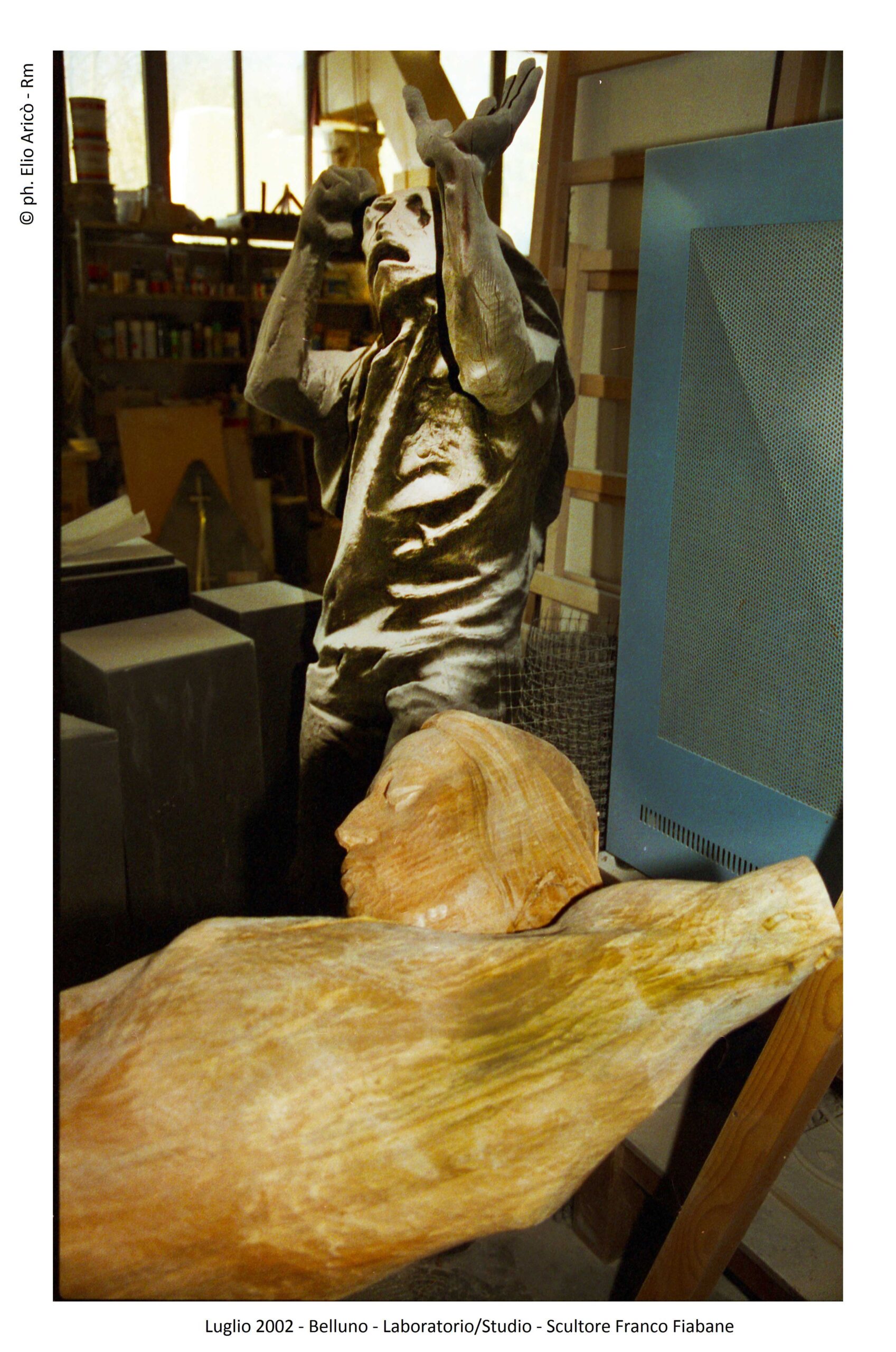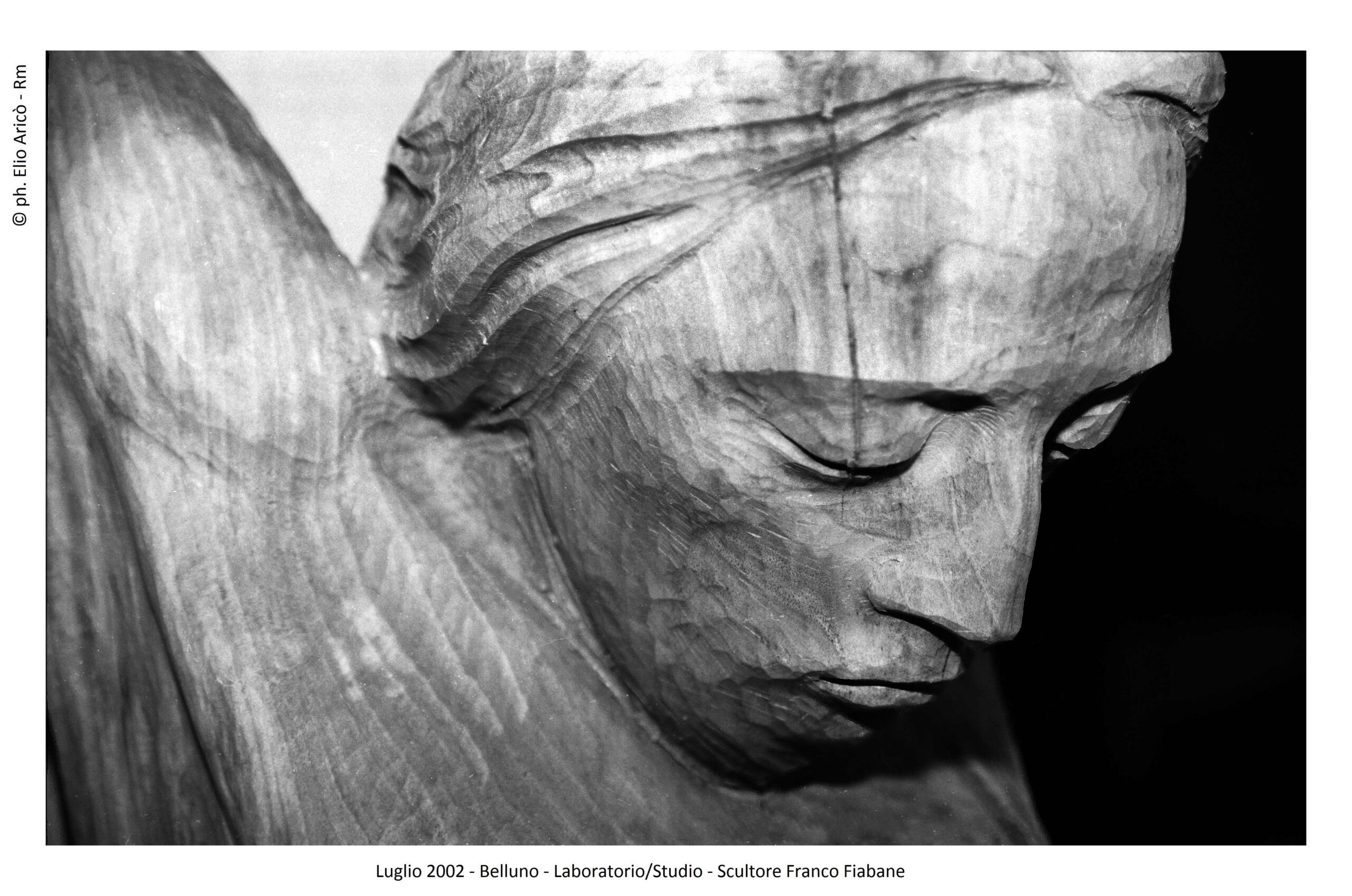 Presentare oggi le fotografie che il fotografo Elio Aricò realizzò nell’estate del 2015 all’artista bellunese Franco Fiabane significa riaprire una stagione carica di emozioni difficili da raccontare. Fu un’estate iniziata con entusiasmo, tra progetti, visite culturali e il desiderio di condividere arte e bellezza, e conclusa purtroppo in una tragedia che colpì profondamente la famiglia e gli amici. Il 10 agosto 2015 Aricò incontrò Franco nel suo laboratorio. Senza impegni urgenti, l’artista si era dedicato alla modellazione di alcune terracotte, opere delicate che confermavano la sua straordinaria versatilità. Tra gli scatti, “Susanna e i vecchioni”, il mascherone di Bacco, allegro e drammatico insieme, e infine la testa dell’Angelo della Chiesa del Nevegal, staccata dal corpo. Un’immagine che, riletta oggi, assume il valore silenzioso di un presagio.