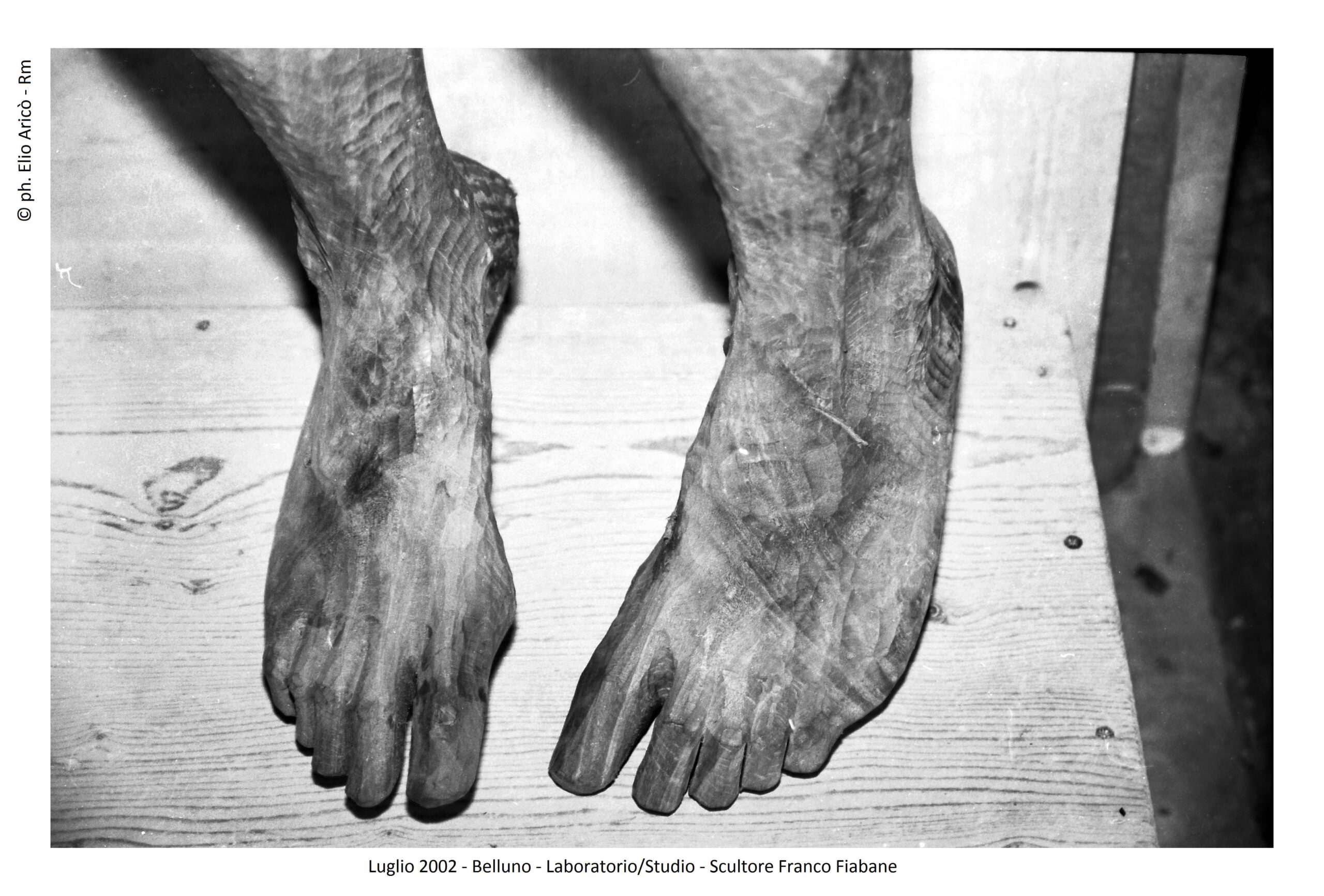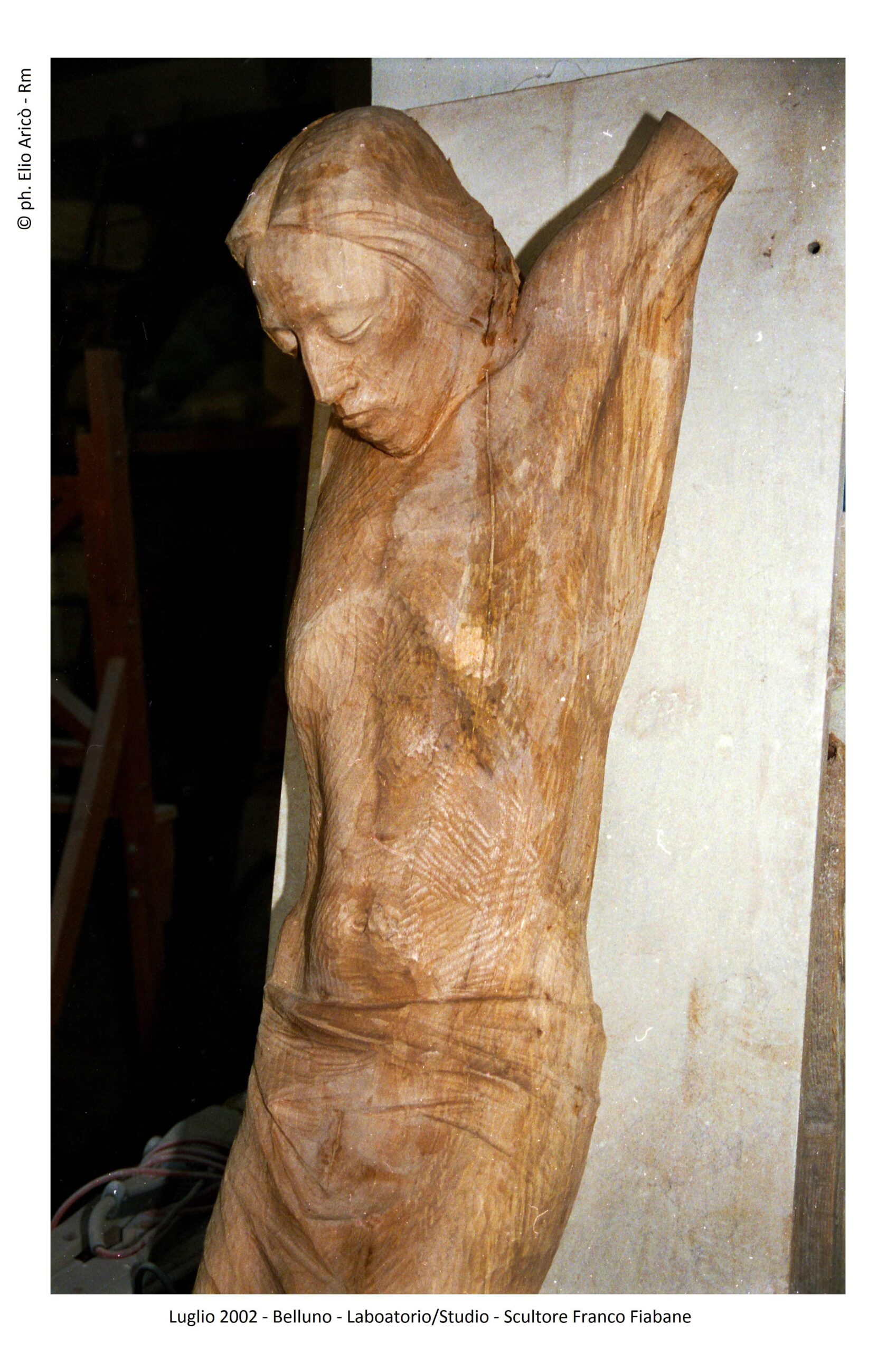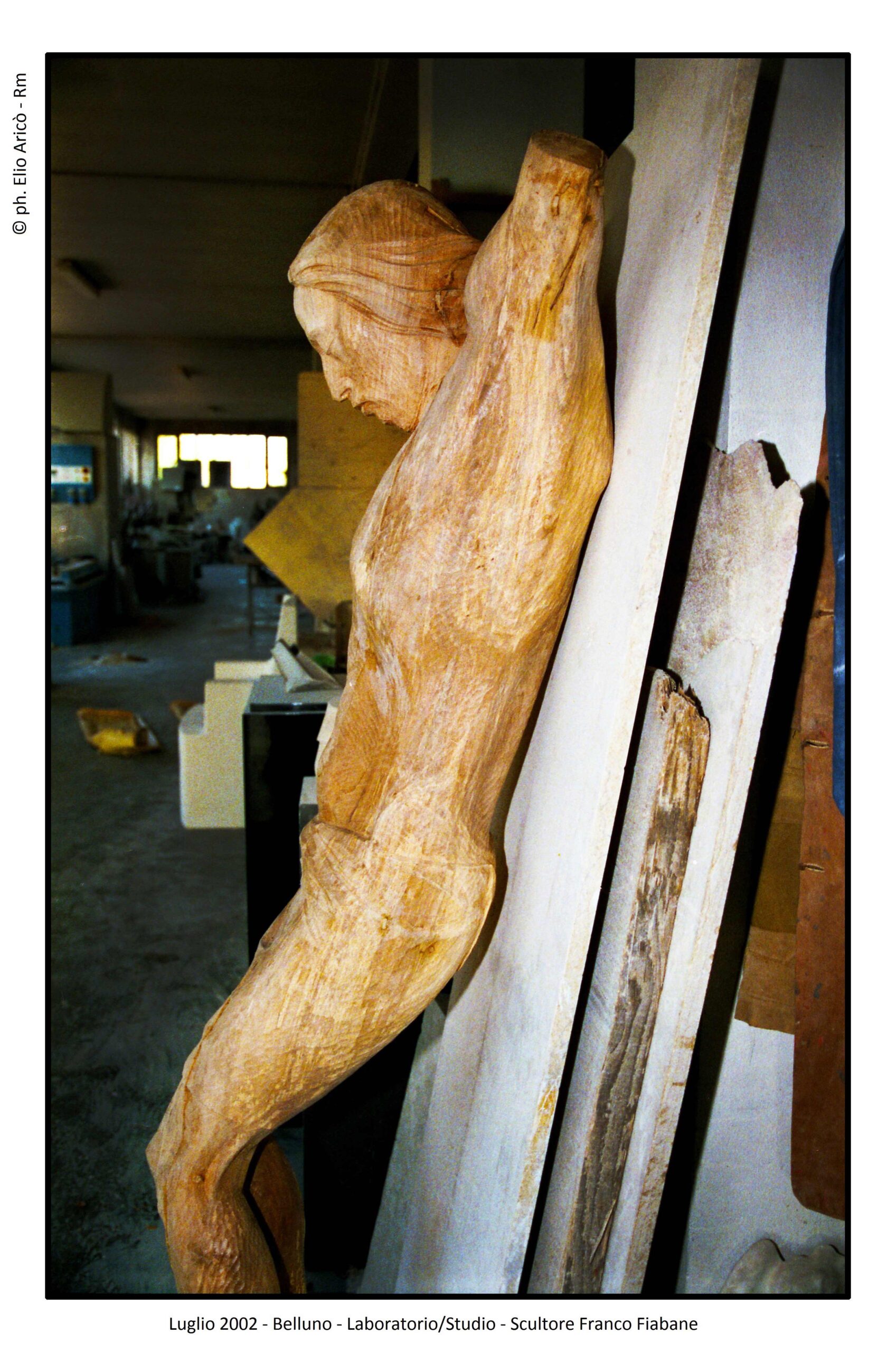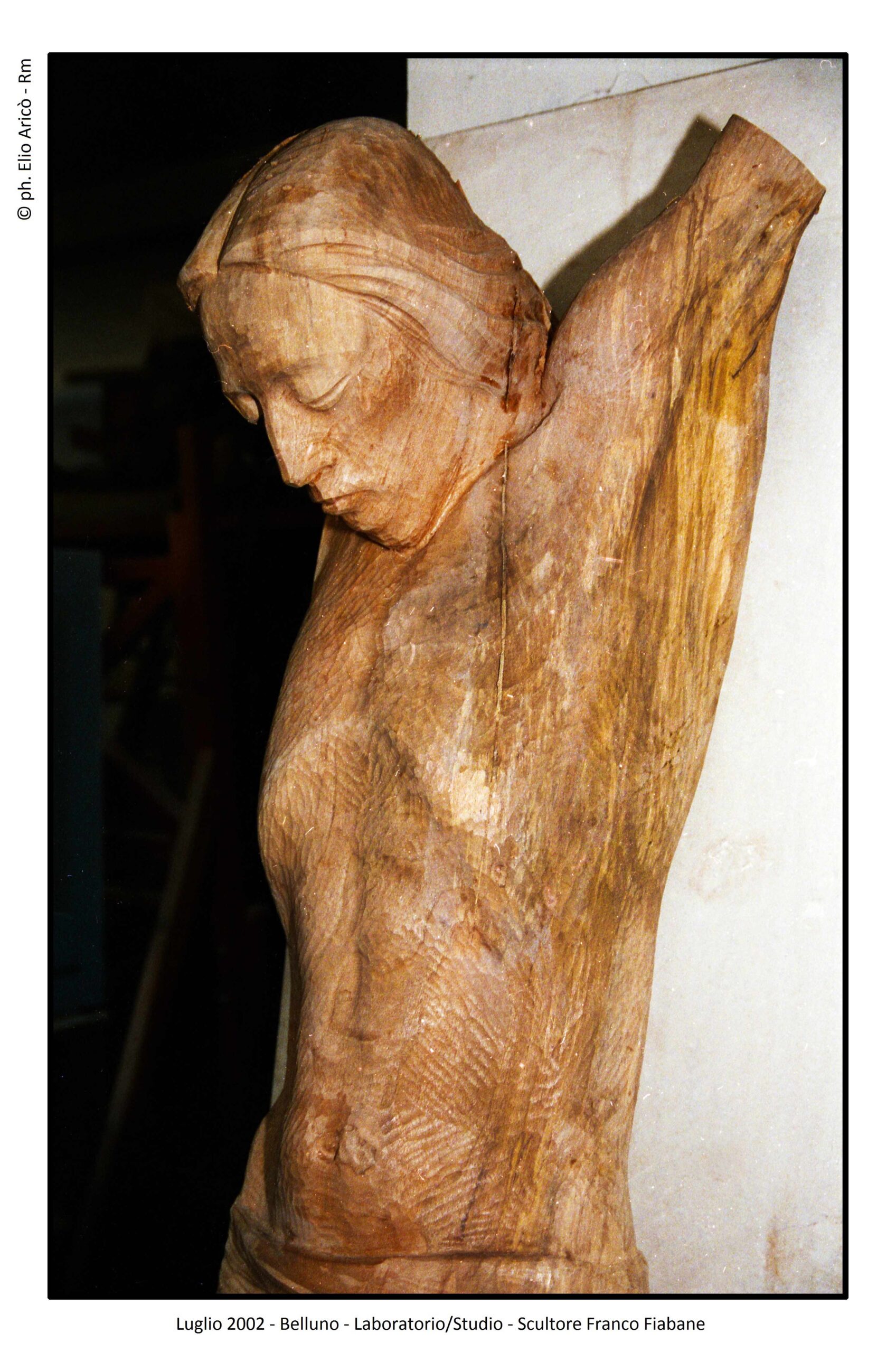 Gli incontri tra Elio e Franco, avvenuti nei mesi di luglio e agosto 2002, sono stati un mix di sacro e profano. Nei primi giorni di luglio, oltre alla consueta esplorazione del laboratorio/studio alla ricerca di qualche spunto interessante, la curiosità del fotografo fu attratta dal realismo anatomico di un Cristo ligneo, depositato in un angolo in attesa di ispirazione. “Mi colpirono in particolare la drammaticità del volto sofferente e le venature del legno, esaltate dal segno dello scalpello” ricorda Elio Aricò