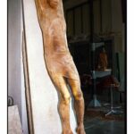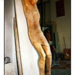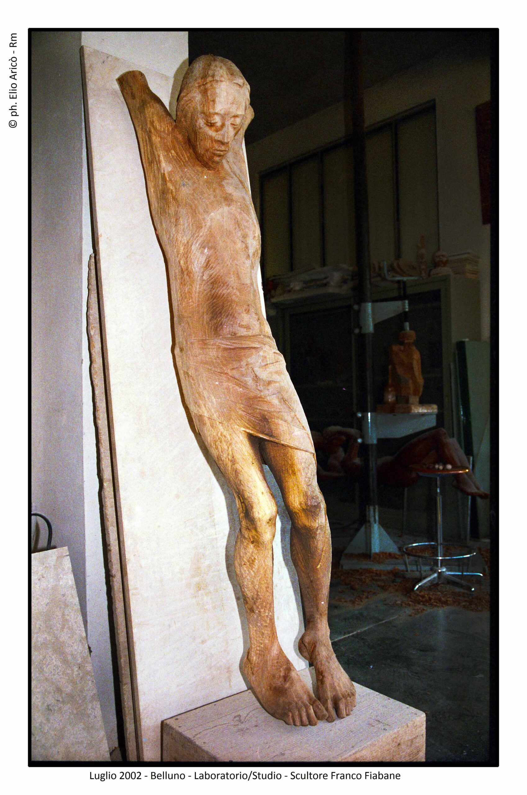 Nel laboratorio di Franco Fiabane, luogo di ricerca e ispirazione. In primo piano, un Cristo ligneo, momentaneamente depositato in un angolo, quasi sospeso in attesa di una nuova intuizione. Colpiscono la drammaticità del volto sofferente e le venature del legno, esaltate dal segno deciso dello scalpello, che restituisce tutta la tensione emotiva della materia.