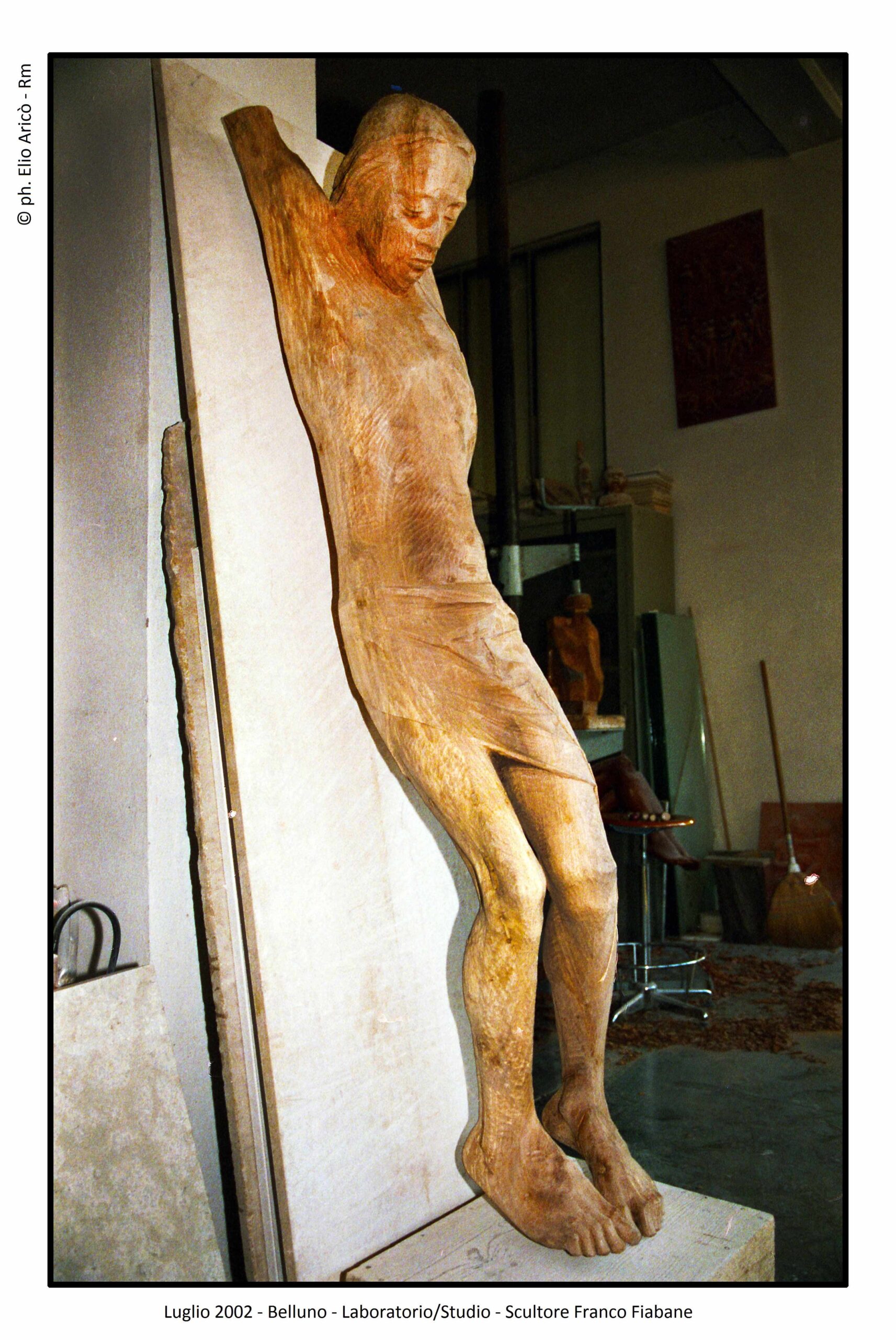 il Cristo deposto è una scultura lignea alla quale Franco Fiabane era profondamente legato. L’opera è stata realizzata nel 2011: la datazione al 2000 riportata nel catalogo è dunque errata e merita una necessaria correzione, importante non solo dal punto di vista archivistico, ma anche per una corretta lettura del percorso artistico dello scultore. Il Cristo deposto rappresenta la più alta e intensa espressione drammatica del dolore che Franco l’artista trasferisce nel legno. È un’opera in cui confluiscono, in modo magistrale, sensibilità umana, studio rigoroso e una straordinaria padronanza del mezzo espressivo. “Franco Fiabane – come ricorda il fotografo-amico Elio Aricò- era infatti estremamente attento all’anatomia umana, oggetto di un’osservazione costante e approfondita nel corso della sua ricerca artistica. In questa scultura egli concentra tutta la sua conoscenza anatomica e la mette al servizio dell’espressione emotiva: il corpo di Cristo non è idealizzato, ma reale, segnato, fragile, profondamente umano”.