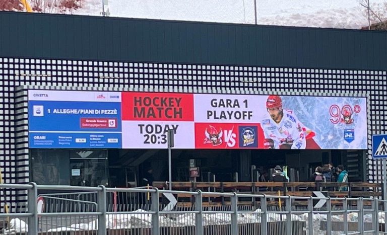 **** REDAZIONE Sul mega schermo di Alleghe Funivie l’invito a partecipare a Gara 1 dei…