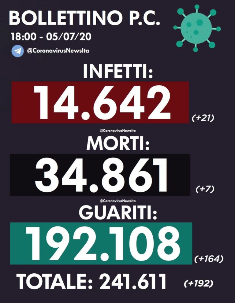 CORONAVIRUS: AGGIORNAMENTO NAZIONALE 05 LUGLIO