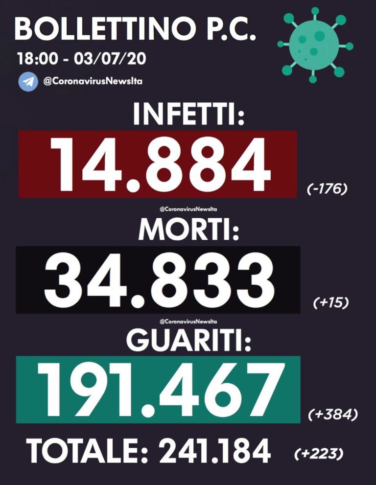 03 LUGLIO INFETTI – 176, MORTI + 15, GUARITI + 384 02 LUGLIO INFETTI –…