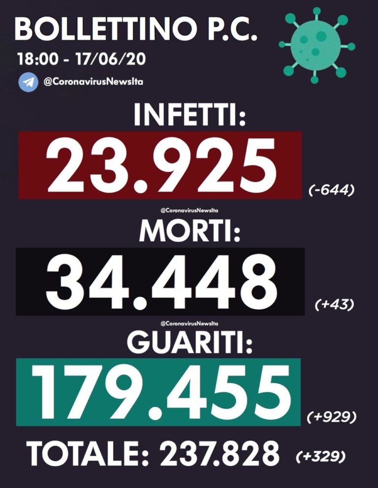 17 GIUGNO INFETTI – 644, MORTI + 43, GUARITI + 929 16 GIUGNO INFETTI –…