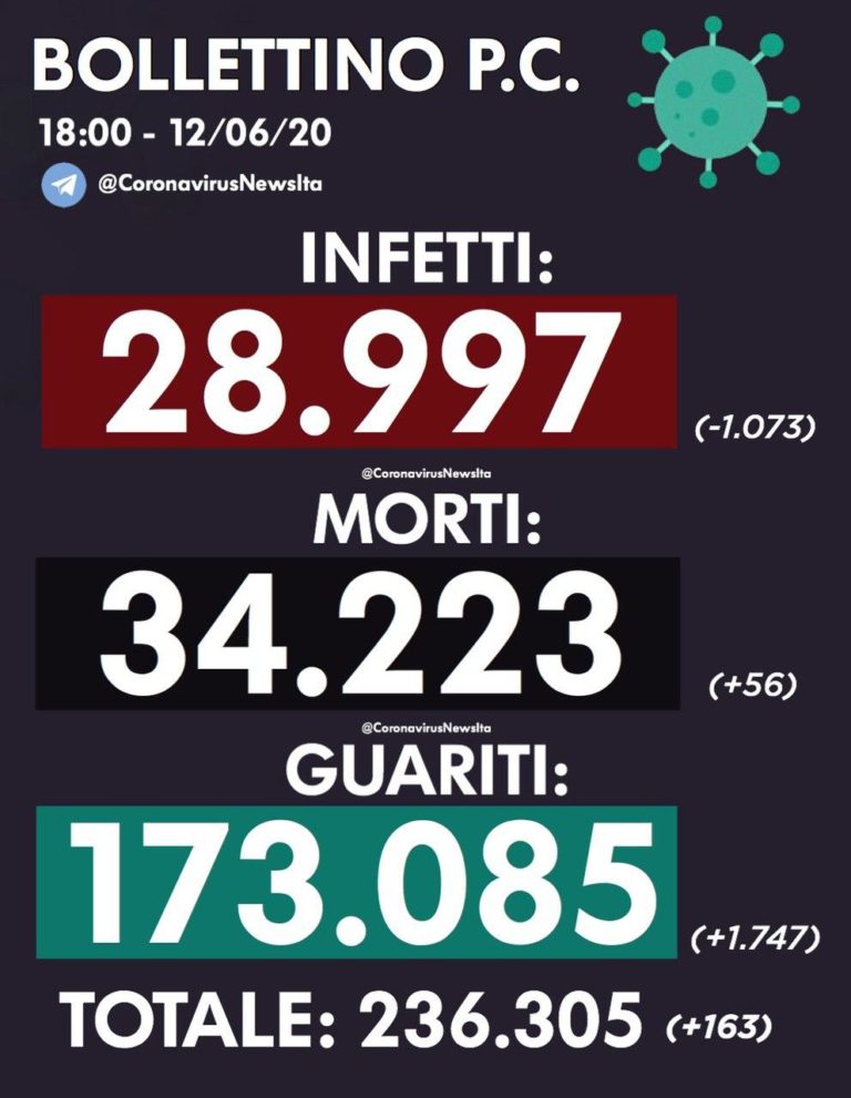 CORONAVIRUS: AGGIORNAMENTO NAZIONALE 12 GIUGNO