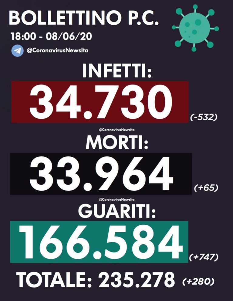 08 GIUGNO INFETTI – 532 , MORTI +65 , GUARITI + 747 07 GIUGNO…