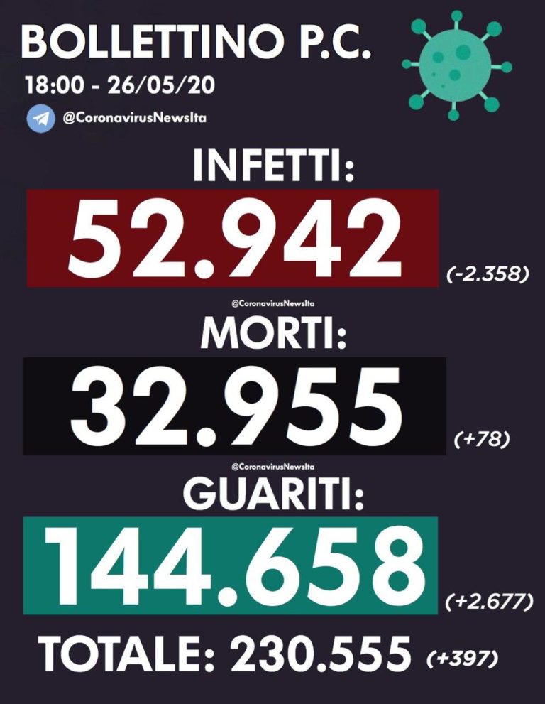 26 MAGGIO INFETTI – 2358, MORTI + 78, GUARITI + 2677 25 MAGGIO INFETTI –…