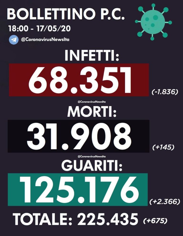 CORONAVIRUS: AGGIORNAMENTO NAZIONALE 17 MAGGIO 2020