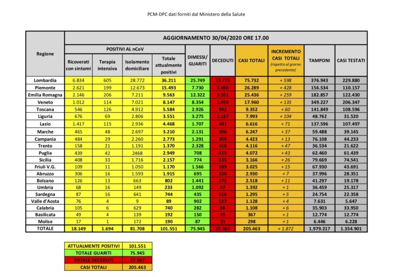 SITUAZIONE TAMPONI E INFETTI AL 30 APRILE IN ITALIA