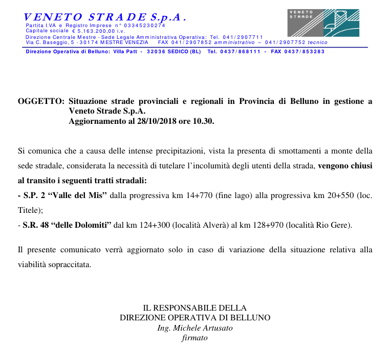 VIABILITA aggiornamento ORE 10.30 del 28.10