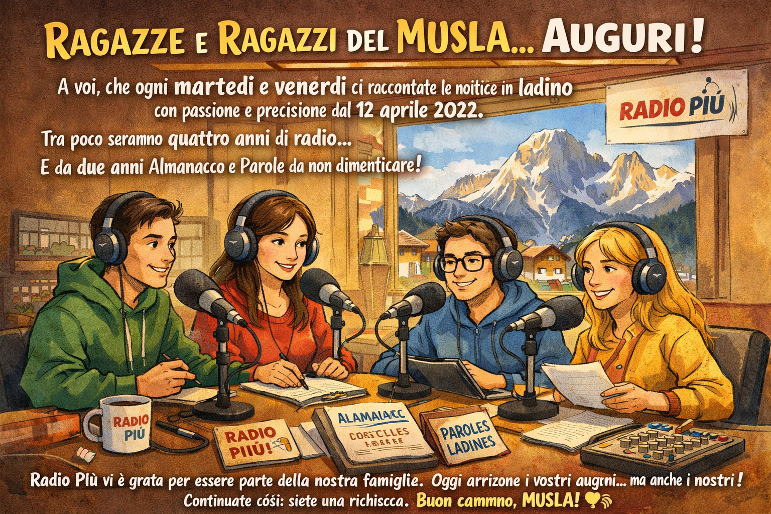 Dal 12 aprile 2022 siete una presenza costante alla radio: una voce giovane, competente e autentica che ha saputo rendere il ladino quotidiano, vivo, condiviso.