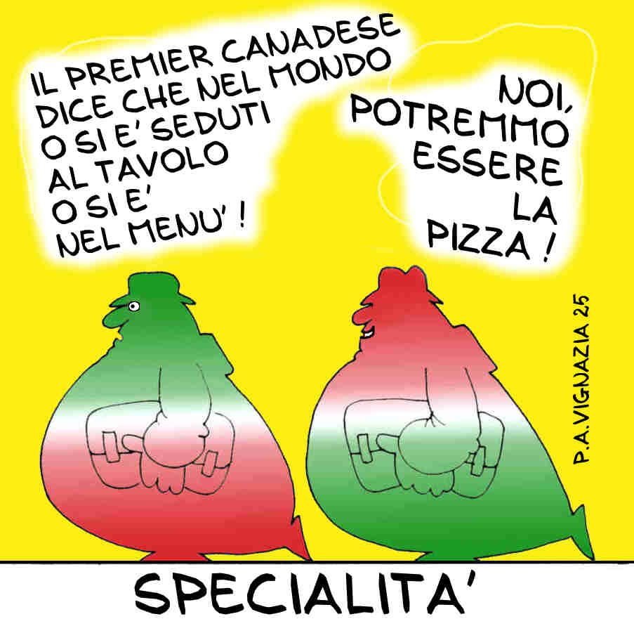 Con la consueta ironia tagliente, Pieraldo Vignazia, “VIP”nella sua vignetta, trasforma una frase del premier canadese in una riflessione geopolitica dal sapore tutto italiano. «O si è seduti al tavolo o si è nel menù», dice uno dei personaggi. La risposta è amara e autoironica: «Noi potremmo essere la pizza».