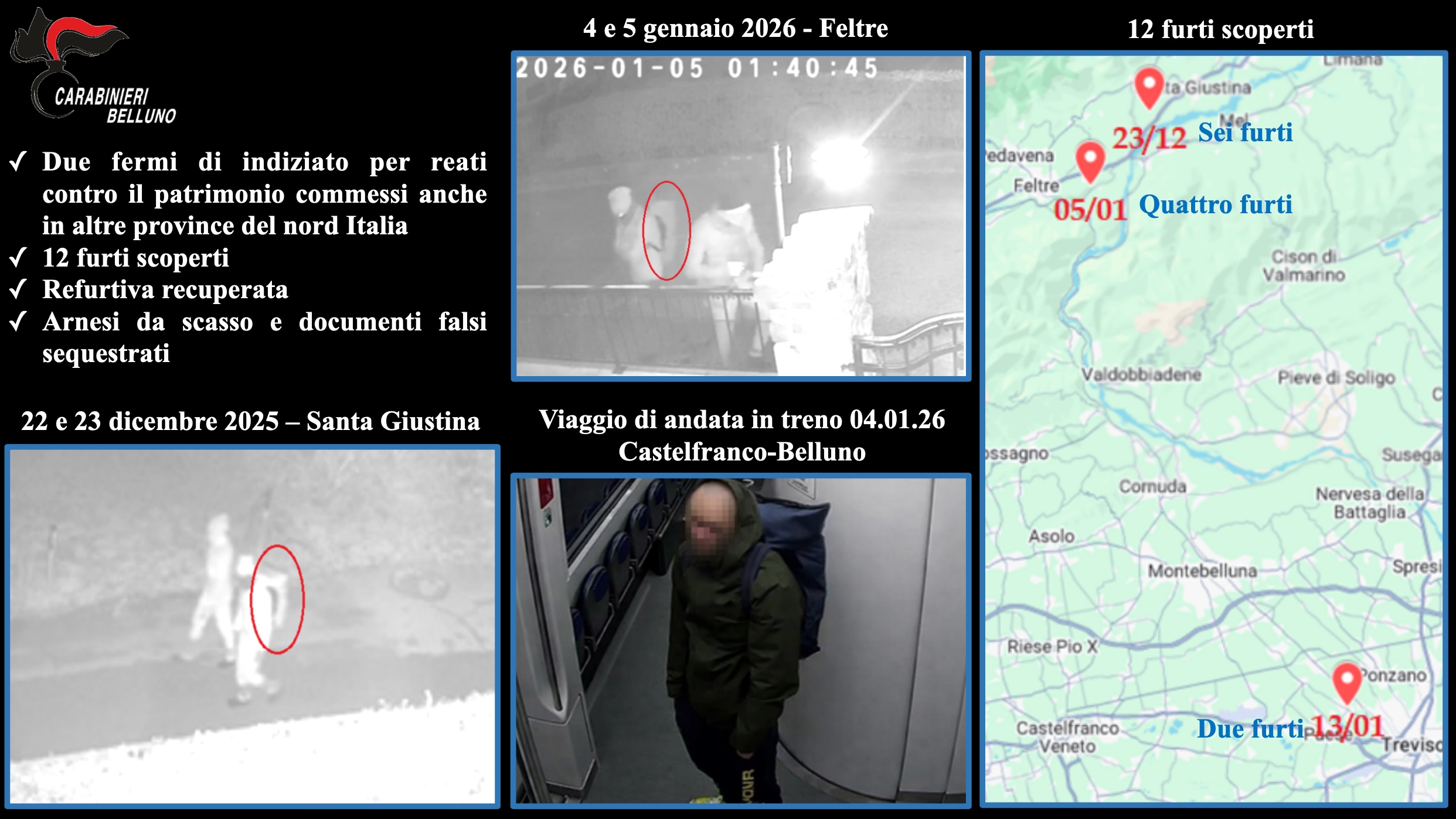 BELLUNO Il 13 gennaio 2026 i Carabinieri della Compagnia di Feltre hanno sottoposto a fermo di indiziato di delitto due soggetti di origine albanese, senza fissa dimora, catturati a Resana, in provincia di Treviso. Il provvedimento è il risultato di una complessa attività investigativa avviata a seguito di numerosi furti in abitazione commessi tra dicembre 2025 e gennaio 2026 nel Bellunese e nel Trevigiano. I raid, messi a segno con un collaudato modus operandi, hanno interessato i comuni di Santa Giustina, Cesiomaggiore, Feltre e Paese, colpendo abitazioni notturne mentre i proprietari dormivano. Fondamentali per le indagini sono state le immagini di videosorveglianza, l’analisi degli spostamenti ferroviari e il segnale GPS di cuffiette rubate, che ha condotto al covo dei sospettati. I due, trovati in possesso di documenti falsi, arnesi da scasso e refurtiva, risultano entrambi con precedenti. Uno di loro era destinatario di un ordine di carcerazione. La refurtiva sarà restituita ai legittimi proprietari. Il GIP ha convalidato il fermo disponendo la custodia cautelare in carcere. Il procedimento è nella fase preliminare.