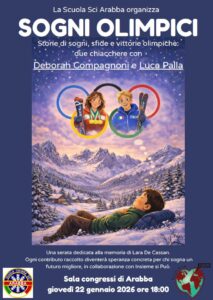 LIVINALLONGO La Scuola Sci Arabba organizza una serata speciale dedicata ai sogni olimpici, allo sport e ai valori che lo rendono unico. “Sogni Olimpici” è un incontro fatto di racconti, emozioni e ispirazione, con due protagonisti d’eccezione: Deborah Compagnoni e Luca Palla. Attraverso due chiacchiere sincere, il pubblico potrà ripercorrere sfide, sacrifici e vittorie che hanno segnato percorsi sportivi straordinari, capaci di accendere la speranza nei più giovani. L’evento è dedicato alla memoria di Lara De Cassan e unisce sport e solidarietà: ogni contributo raccolto diventerà un aiuto concreto per chi sogna un futuro migliore, in collaborazione con Insieme si Può. L’appuntamento è giovedì 22 gennaio 2026 alle ore 18.00, presso la Sala Congressi di Arabba.