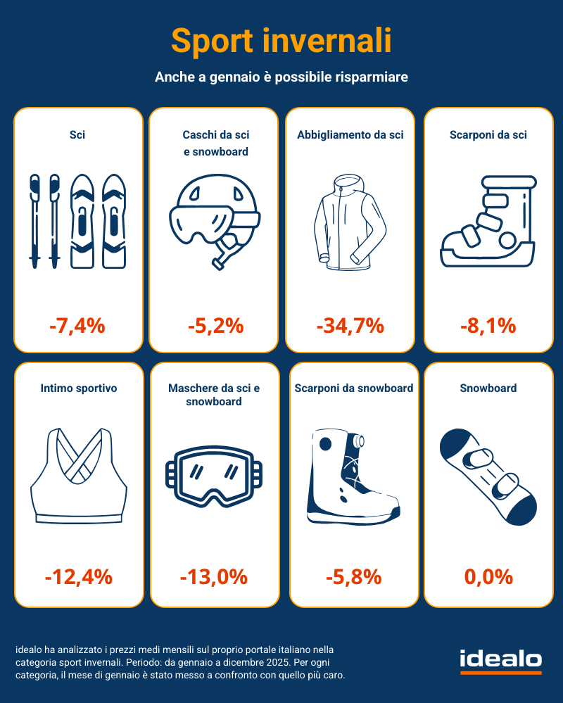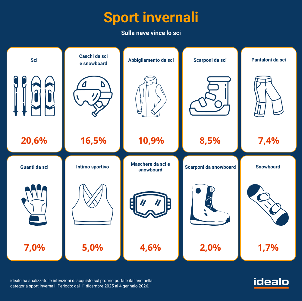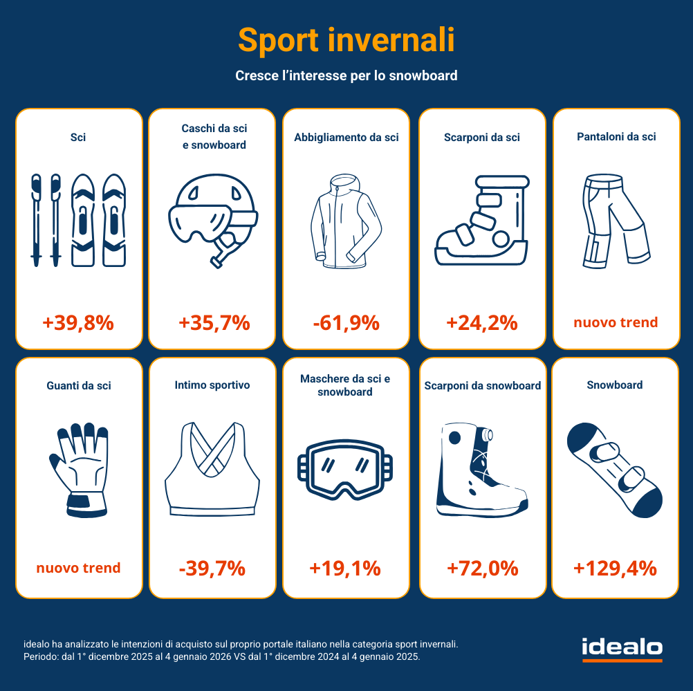 La stagione invernale 2025/26 si apre con segnali positivi per gli sport sulla neve. Secondo i dati di idealo, l’interesse complessivo cresce del 9% su base annua, confermando che sci e montagna restano centrali nel tempo libero degli italiani. A cambiare è però il comportamento d’acquisto: sempre meno pianificazione anticipata e sempre più scelte prese all’ultimo momento, spesso a ridosso della partenza. Lo sci rimane il protagonista assoluto, concentrando oltre un quinto dell’interesse totale e registrando un aumento delle ricerche vicino al 40% rispetto allo scorso anno. Accanto allo sci, emerge con forza lo snowboard, che pur restando una nicchia, fa segnare una crescita record, con ricerche più che raddoppiate e picchi subito dopo le festività natalizie. Sempre più centrale il tema della sicurezza. Caschi e maschere guidano l’interesse, superando l’abbigliamento, segno di una maggiore consapevolezza da parte di chi frequenta le piste. Dopo Natale si registra infatti un vero boom di acquisti di accessori e attrezzatura essenziale, mentre l’abbigliamento viene comprato solo se necessario. Anche i prezzi seguono una logica stagionale: dicembre è il mese più caro, mentre da gennaio iniziano i ribassi, spesso prima dei saldi ufficiali. I dati storici indicano risparmi che possono arrivare fino al 30%, premiando chi sa attendere il momento giusto. La montagna, insomma, resta una passione forte ma sempre più razionale: meno impulso, più attenzione a sicurezza, funzionalità e convenienza.