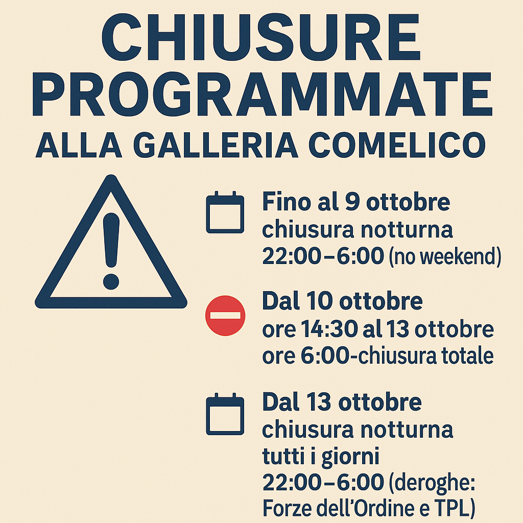 ⛔ Dal 10 ottobre ore 14:30 al 13 ottobre ore 6:00 → prevista la chiusura totale al traffico della galleria.
