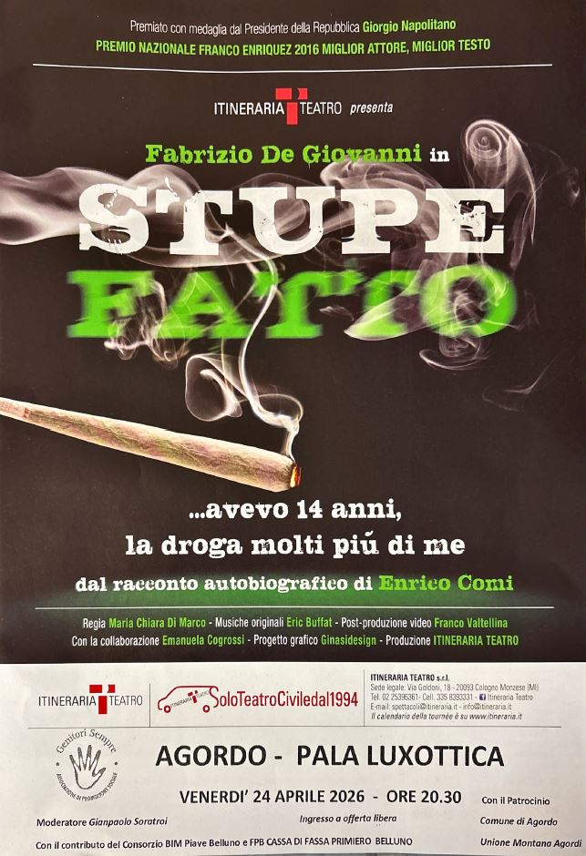 L’opera è uno dei lavori più noti del teatro civile italiano e affronta con intensità il tema della dipendenza dalle droghe, attraverso la storia vera di un giovane, tratta dal libro autobiografico di Enrico Comi. Lo spettacolo, scritto per sensibilizzare soprattutto i più giovani, racconta il percorso di caduta e consapevolezza del protagonista, mettendo in luce le dinamiche sociali e psicologiche che portano all’uso di sostanze stupefacenti. La narrazione, intensa e coinvolgente, è affidata all’interpretazione di De Giovanni, attore impegnato da anni nel teatro sociale e civile. “Stupefatto” ha ottenuto numerosi riconoscimenti ed è stato rappresentato in tutta Italia con centinaia di repliche, diventando un importante strumento educativo nelle scuole e nelle comunità. L’appuntamento di Agordo si inserisce in un tour nazionale dedicato alla prevenzione e alla riflessione sui rischi delle dipendenze. Uno spettacolo che unisce teatro e impegno sociale.