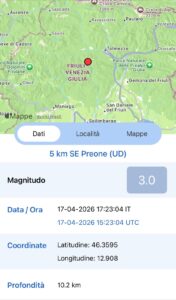 REDAZIONE La terra ha tremato oggi alle 13:24 e alle 17:23 a pochi chilometri dal comune di Verzegnis in provincia di Udine. la prima scossa di magnitudo 3.1 sulla scala Richter ad una profondità di 8.6 km, mentre la seconda di magnitudo 3 ad una profondità di 10 km. Le scosse sono state registrate anche dai sismografi di Agordo ed Alpago