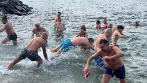 Tra i partecipanti anche un bambino di cinque anni, accompagnato dai familiari, e il più anziano del gruppo, un settantacinquenne che non ha voluto rinunciare all’appuntamento. Dopo il conto alla rovescia e gli applausi dei presenti, i tuffatori si sono immersi rapidamente nell’acqua, tra incitamenti e sorrisi.