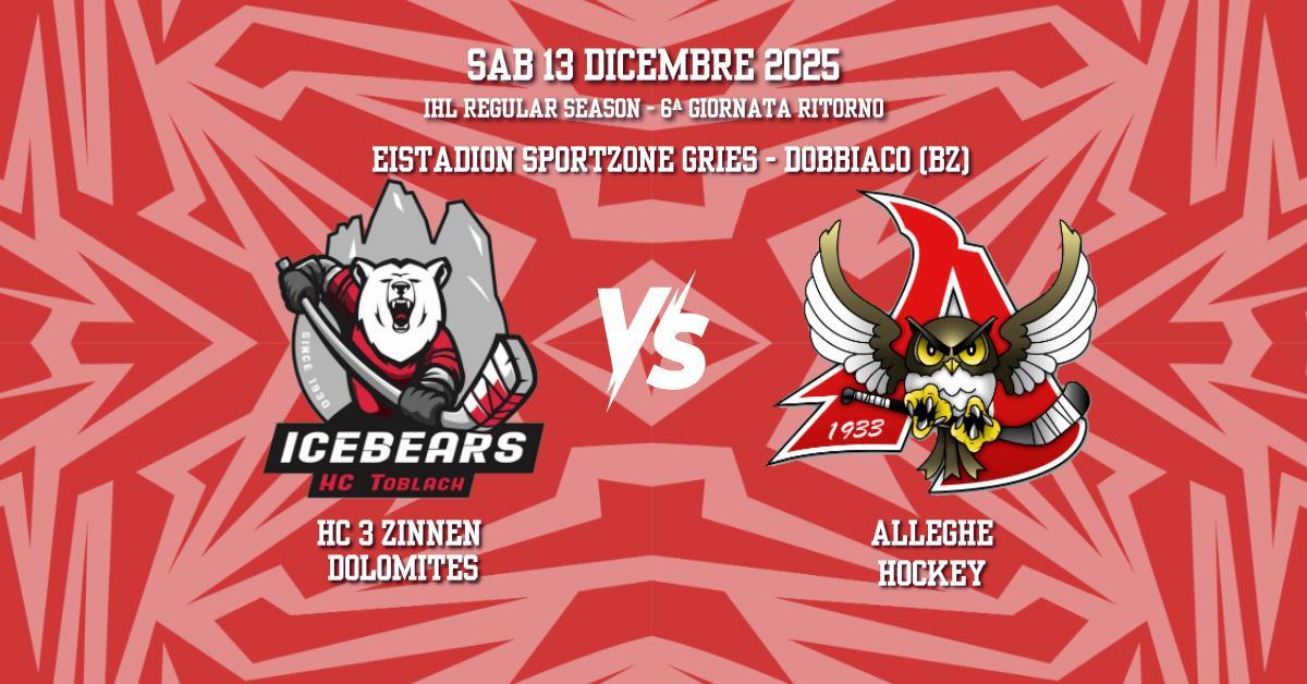 HC 3 ZINNEN DOLOMITES – ALLEGHE HOCKEY Sabato 13 dicembre ore 19:30 – Eistadion Sportzone Gries di Dobbiaco (BZ). Arbitri: Alexander Wiest e Luca Zatta con giudici di linea Andreas Bicciato e Matteo De Cristofaro. Collegamenti in DIRETTA RADIOFONICA su Radio Più (www.radiopiu.net) con “hockey al punto giusto”, in studio Marco Gaz e da Dobbiaco interventi di Federico Paganin