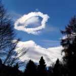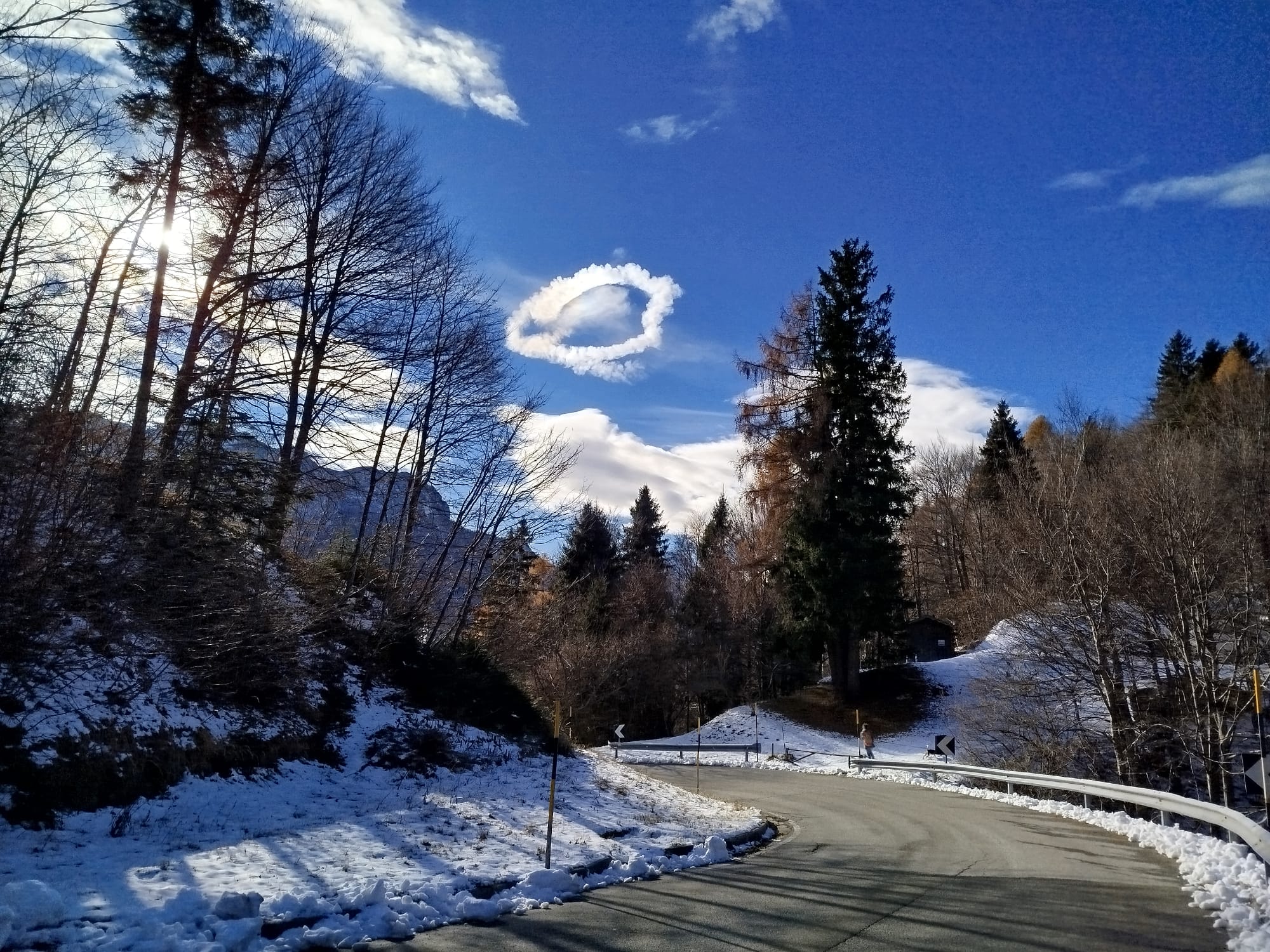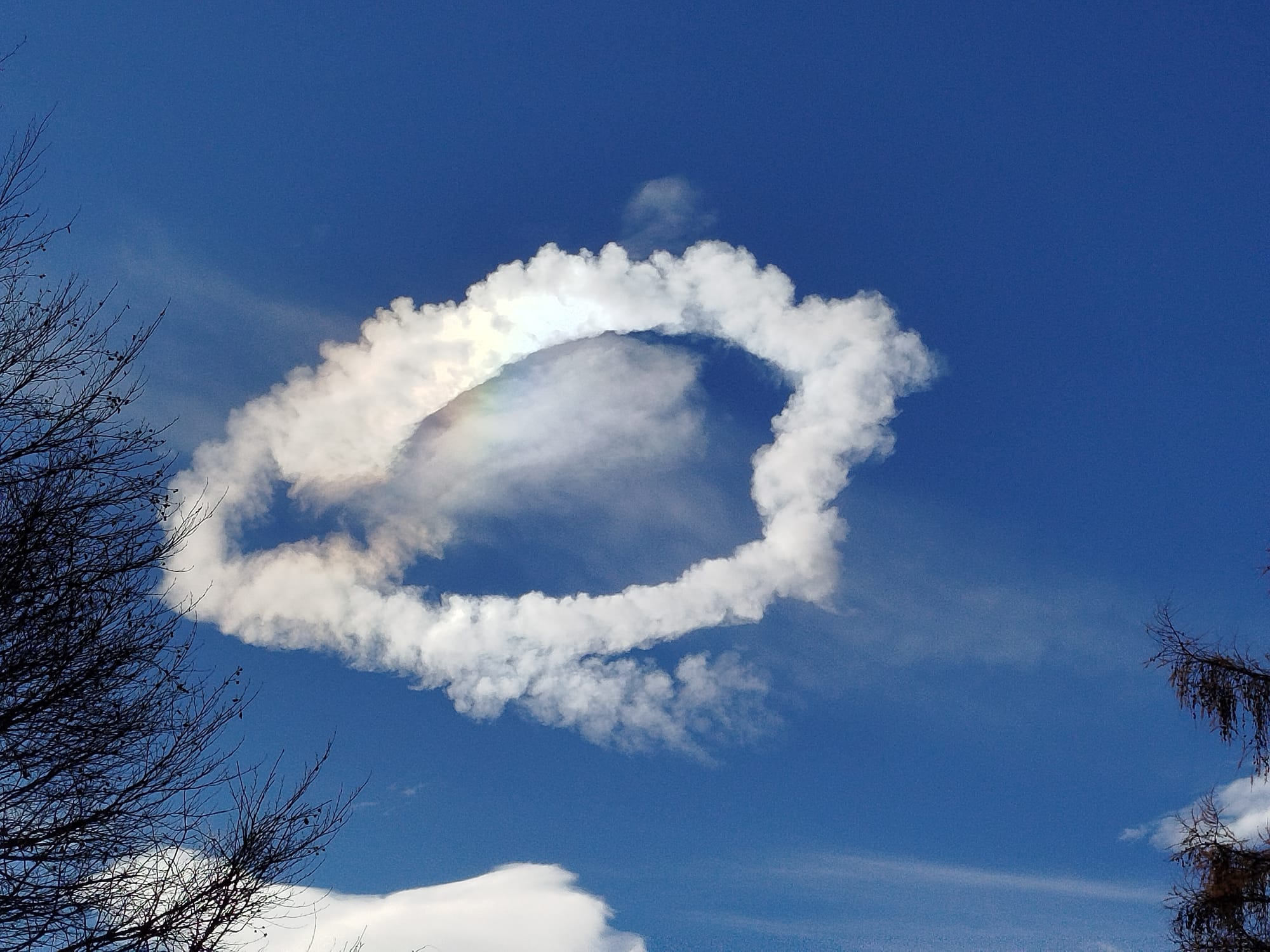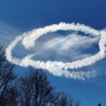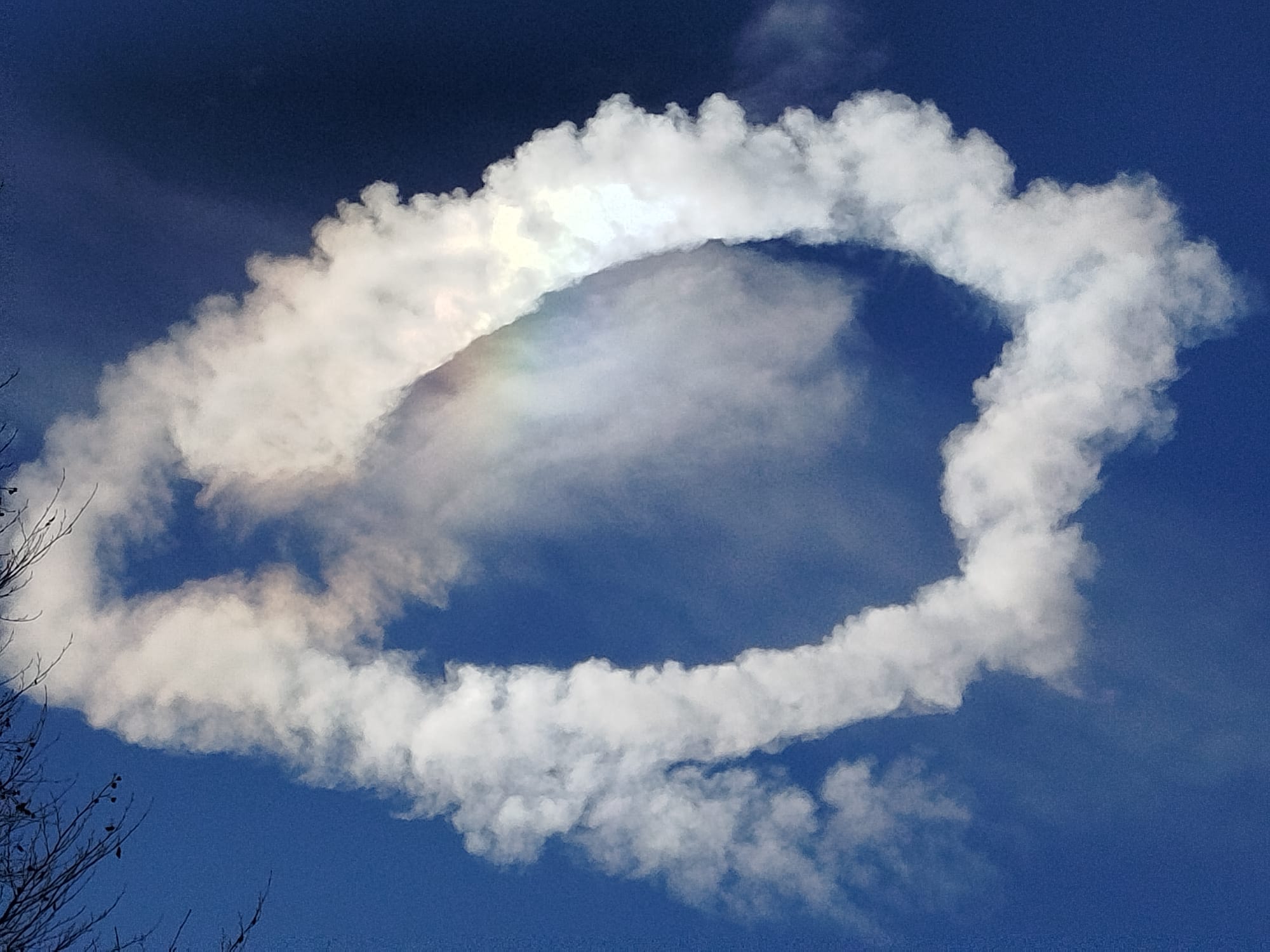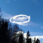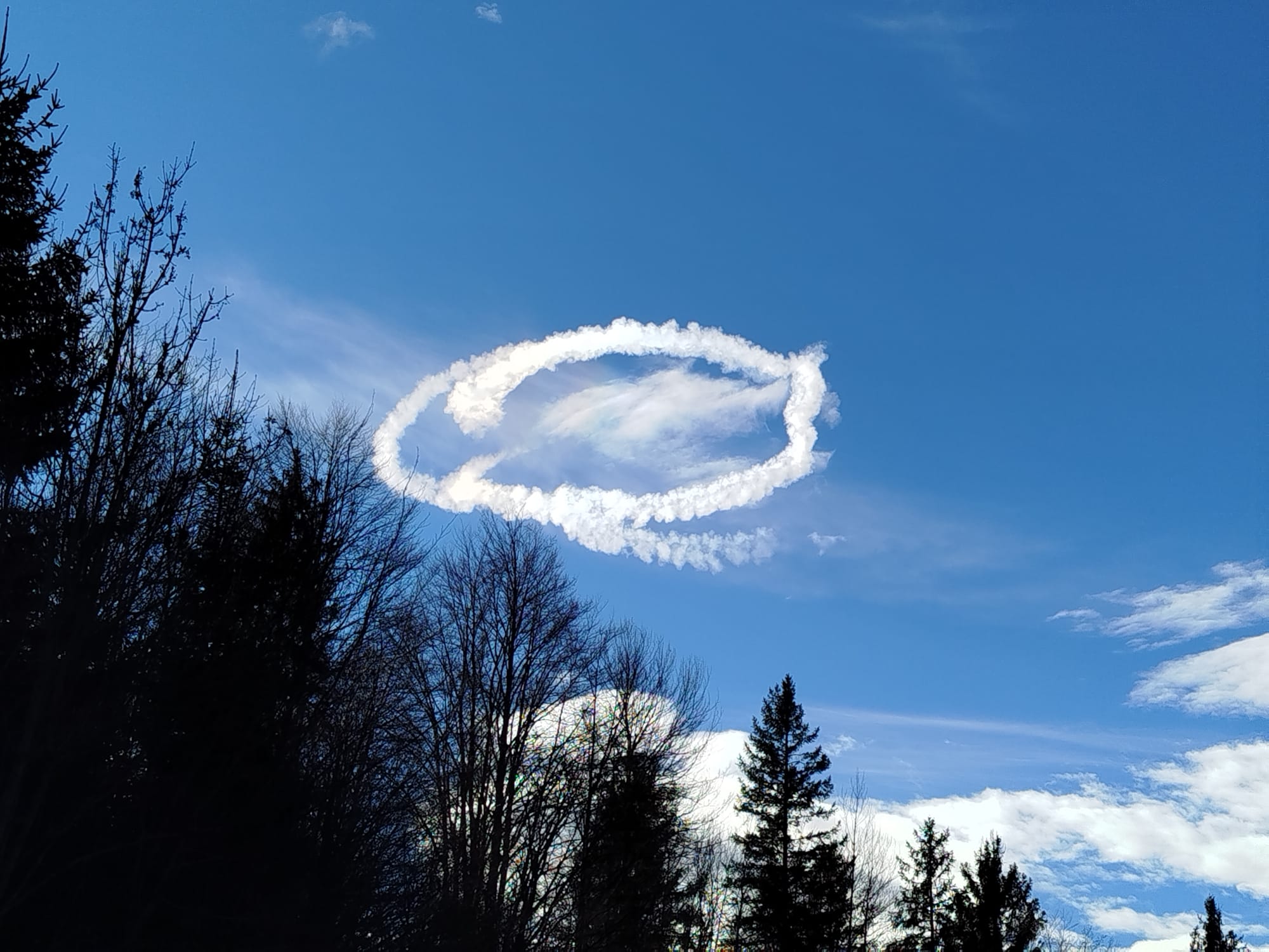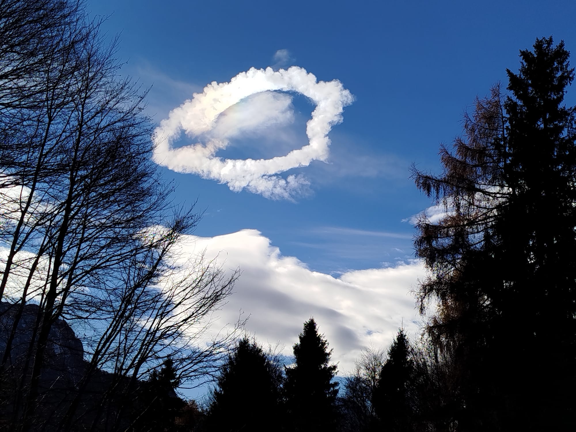 Per qualche istante lo sguardo va allo spazio e la fantasia corre agli extraterrestri: un grande anello di fumo sospeso nel cielo azzurro, sopra le sagome scure degli alberi. In molti hanno pensato a un UFO, ma lo spettacolo è il risultato di una manovra acrobatica di un aereo, anzi due che, con la sua scia di condensazione, ha “disegnato” un cerchio perfetto tra le nuvole. Un gioco di aria, luce e velocità che ha regalato un’immagine sorprendente, capace di far sognare e sorridere.