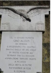 FELTRE Un anno fa è stato inaugurato il Terminal Urbano dell’aeroporto “Gino Allegri” a Padova, progetto promosso dalla società di gestione Heron Air, spazio che integra lo scalo nel tessuto culturale e sociale della città, rendendolo un punto di riferimento per eventi, mostre, festival, mercatini e conferenze Il 16 novembre scorso si è svolta la presentazione congiunta dei libri “I riflessi della montagna parlano di me” di Katia Voltolina e “La Pèca del Diavolo” di Wild Tors, due opere intrecciate da emozione, natura e introspezione personale. All’incontro condotto e patrocinato dal Centro Internazionale del Libro Parlato (C.I.L.P.), hanno partecipato numerosi ospiti provenienti dal mondo dell’arte e della cultura. In questa occasione è stato ricordato il legame fra l’aviatore e militare Girolamo Allegri e Feltre; nel portale del Comune vi è infatti un settore dedicato ai monumenti della Grande Guerra, nato da una idea di Giovanni Trimeri, Un esempio è dato dalla lapide che si trova allo Zugni Tauro, che ricorda «la beffa di Feltre». Come si legge nel portale, la lapide è dedicata a Gino Allegri (Fra Ginepro, Venezia 1893 – S. Pelagio 1918) autore di un intrepido sorvolo a scopo ricognitivo, del campo di aviazione austriaco di Feltre. Un’aquila in picchiata che sormonta gli stemmi della città di Feltre e di casa Savoia sovrasta la scritta: «Nel VII giugno 1918 / Gino Allegri / da Venezia / il leggendario Fra Ginepro /disceso dalle vie del cielo / su invitte italiche ali / seminava fra gli invisori / ammirazione terrore e morte / a ricordo della beffa di Feltre / ravvivatrice di fede / il Comune //”. “La beffa di Feltre” avvenne il 7 luglio 1918: il pilota Gino Allegri, compagno di Gabriele D’Annunzio, sorvolò il campo. “A pochi metri da terra l’apparecchio si rizzò e sfiorando i tetti delle case eseguì due voli fulminei sul campo d’aviazione, mitragliando e lanciando bombe”. Ad Allegri venne conferita la medaglia d’oro al Valor militare.
