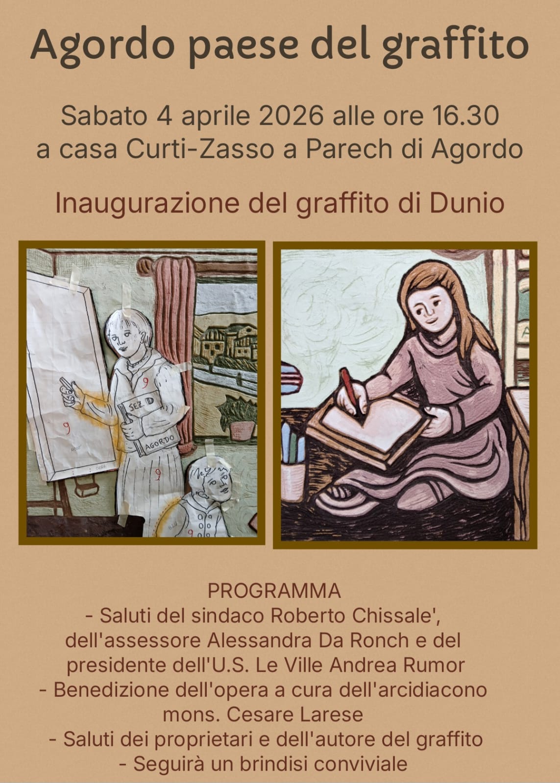 AGORDO Sabato 4 aprile 2026, alle 16.30, a Parech di Agordo, presso l’abitazione della famiglia Curti e delle famiglie Zasso, verrà scoperta la trentunesima opera dell’iniziativa “Agordo Paese del Graffito”. Alla presenza del sindaco di Agordo, Roberto Chissalè, dell’assessore Alessandra Da Ronch, del presidente dell’U.S. Le Ville, Andrea Rumor, e con la benedizione dell’arcidiacono don Cesare Larese, i proprietari e l’autore Dunio Piccolin sveleranno la nuova creazione. Il soggetto dell’opera resta ancora avvolto nel massimo riserbo. L’iniziativa, “Agordo paese del graffito ” avviata nel 2010, si sviluppa lungo le pareti dei borghi di Toccol, Parech e Prompicai, configurandosi ormai come un vero e proprio museo a cielo aperto tra case rustiche, fienili, lavatoi, fontane e chiesette. Grazie ai graffiti, che raccontano storie, tradizioni e personaggi della comunità, Agordo è diventato un luogo in cui arte e memoria si intrecciano sulle facciate delle abitazioni, dando vita a un suggestivo itinerario culturale. Guardando al passato, è naturale ricordare i dodici artisti che hanno partecipato, le persone che hanno collaborato e i numerosi visitatori. Restano vive anche le cene in compagnia organizzate come momento di accoglienza per gli artisti, spesso promosse dai proprietari delle pareti, veri e propri committenti delle opere in collaborazione con la locale Ad Pro Loco Agordo e i vari sponsor. Quest’anno, per mezza giornata, ha collaborato anche Beatrice, nipote della famiglia Curti: un episodio che richiama alla memoria i tanti alunni della scuola primaria di Agordo che, dal 2010 al 2019, hanno preso parte alla realizzazione dei graffiti, conservando ancora oggi un ricordo positivo di quell’esperienza. Proprio in questi mesi è in corso un progetto Interreg, coordinato dal Comune di Agordo nella persona di Alessandra Da Ronch e progettato finalizzato alla valorizzazione del percorso: sono previsti la realizzazione di un sito internet, una mappa dedicata e l’installazione, per ogni graffito, di una tabella con QR code contenente informazioni sull’opera e sul suo significato, oltre ad altre iniziative di promozione in un progetto web e grafico a cura di Andrea De Nardin.