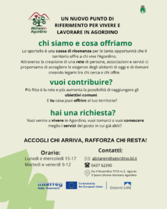 AGORDO Un nuovo punto di riferimento per chi vive, lavora o desidera trasferirsi in Agordino: è lo Sportello “Abitare in Agordino”, un’iniziativa nata per mettere in rete persone, associazioni e servizi, e per valorizzare le opportunità che il territorio offre. Lo sportello si presenta come una “cassa di risonanza” delle risorse locali, con l’obiettivo di creare legami tra chi cerca e chi offre, accogliendo i bisogni degli abitanti di oggi e di domani. Attraverso la costruzione di una rete di collaborazione tra enti e cittadini, si punta a favorire la coesione sociale e a sostenere chi desidera contribuire attivamente alla vita della comunità. Chi vuole partecipare o offrire il proprio contributo può entrare a far parte della rete, condividendo idee, servizi e competenze per raggiungere obiettivi comuni. Allo stesso modo, chi ha una richiesta — per vivere, lavorare o conoscere meglio i servizi locali — può rivolgersi allo sportello per ricevere orientamento e supporto. Lo slogan che accompagna l’iniziativa, “Accogli chi arriva, rafforza chi resta”, riassume perfettamente la missione del progetto: favorire un Agordino aperto, solidale e capace di crescere insieme. Lo sportello si trova ad Agordo alla sede dell’Unione Montana Agordina (Via 4 Novembre 1918 n.2, 3° piano). Orari di apertura: Lunedì e mercoledì 15.00–17.00, martedì e venerdì 9.00–12.00. Email: [email protected]. Telefono: 0437 62390 L’iniziativa rientra nel progetto Interreg Italia–Austria Dolomiti Live, cofinanziato dall’Unione Europea, e rappresenta un passo concreto verso un futuro più connesso e partecipato per la comunità agordina.